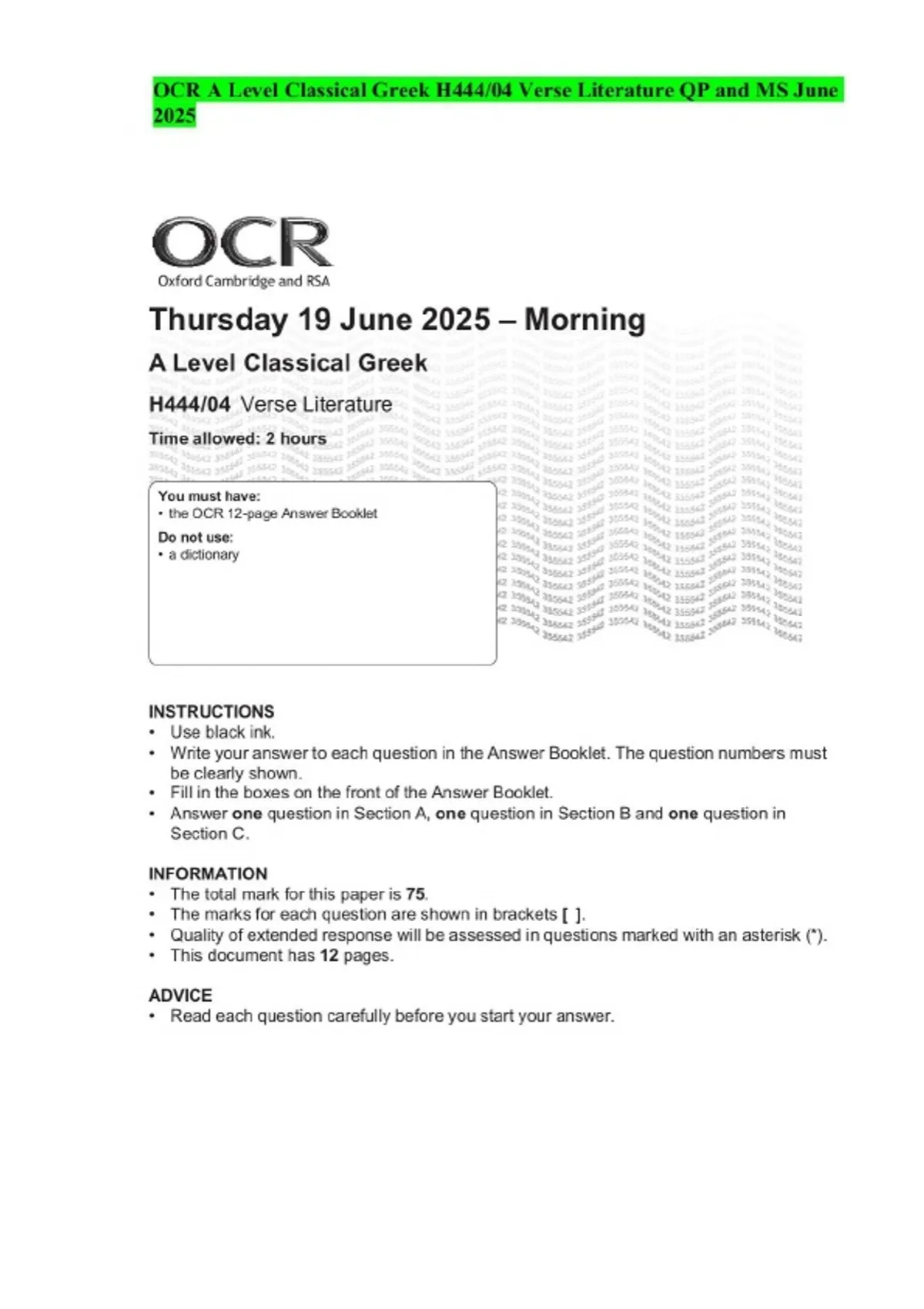 OCR A Level Classical Greek H444/04 Verse Literature QP and MS June 2025