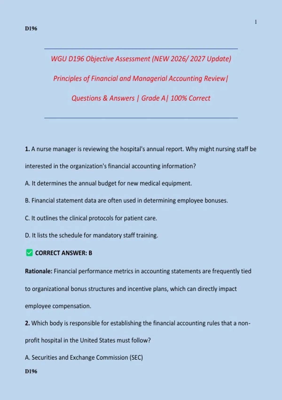 WGU D196 Objective Assessment (NEW 2026/ 2027 Update) Principles of Financial and Managerial Accounting Review| Questions & Answers | Grade A| 100% Correct