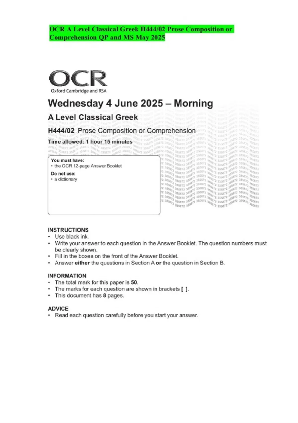 OCR A Level Classical Greek H444/02 Prose Composition or Comprehension QP and MS May 2025