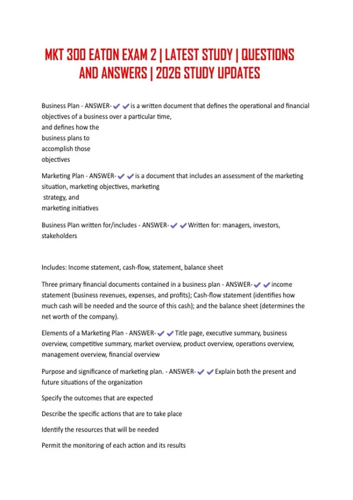 Elements of a Marketing Plan - ANSWER- Title page, executive summary, business