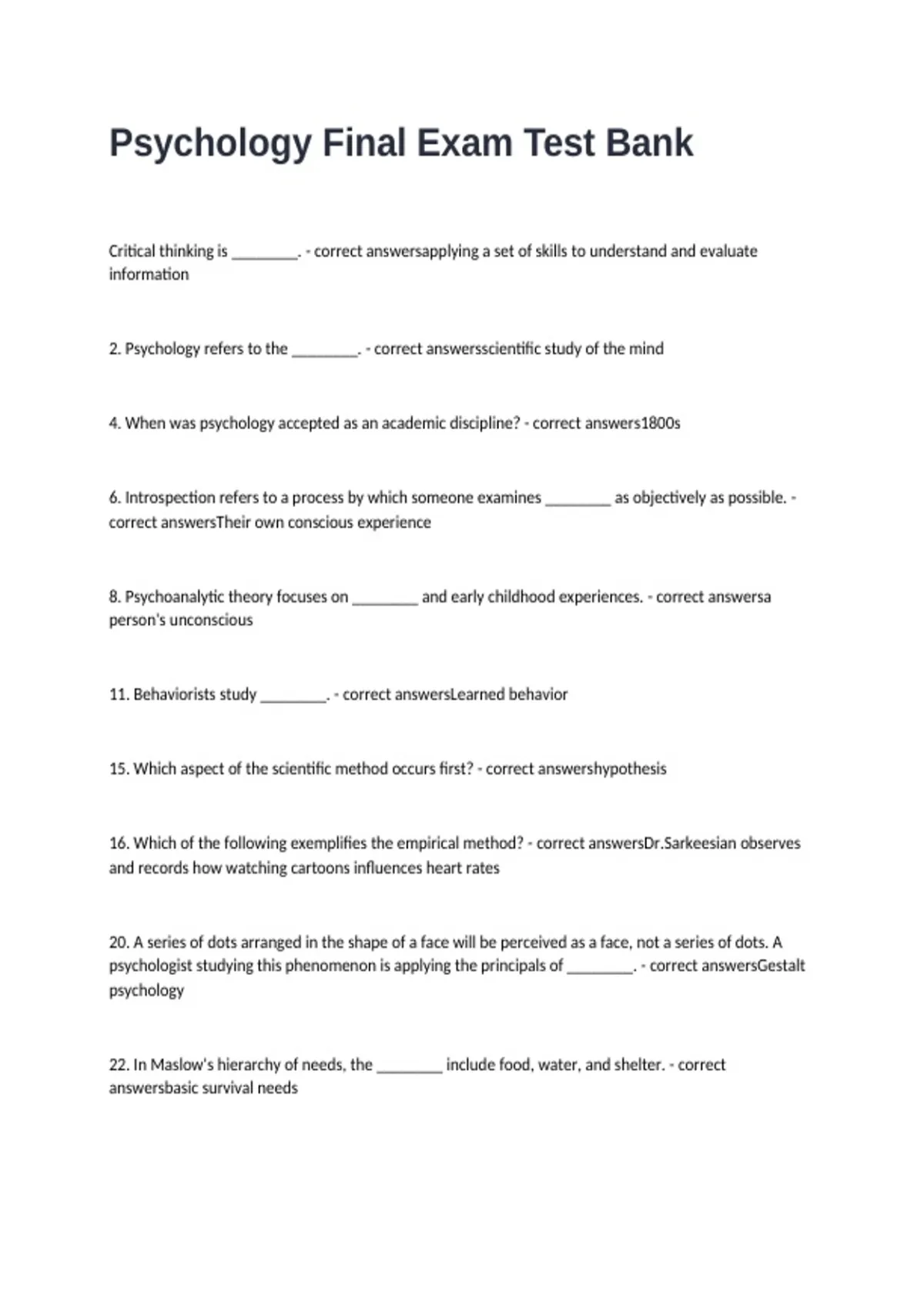Psychology Final Exam Test Bank Complete Solutions 100% Verified Answers Graded A+.