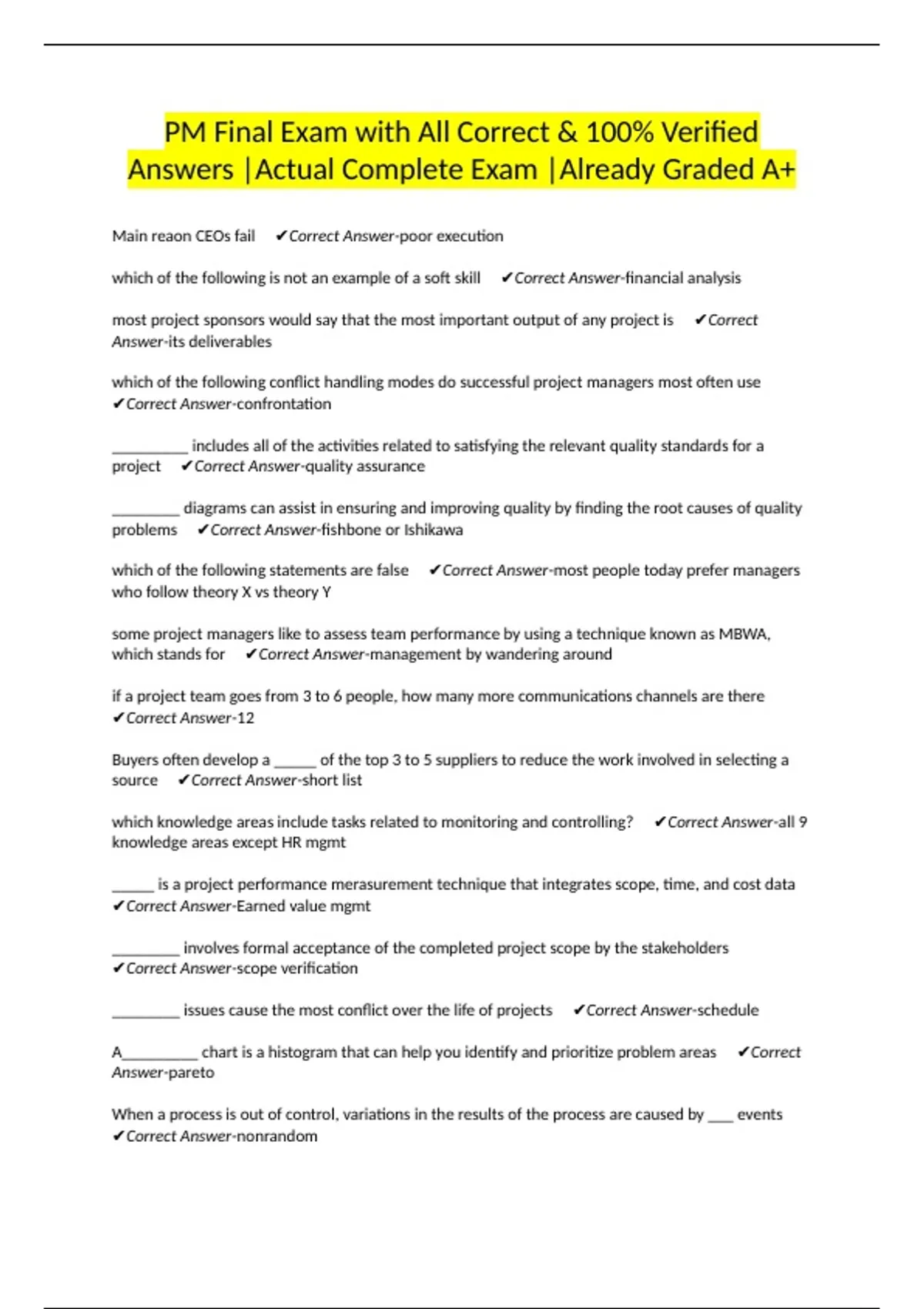 PM Final Exam with All Correct & 100% Verified Answers |Actual Complete Exam |Already Graded A+