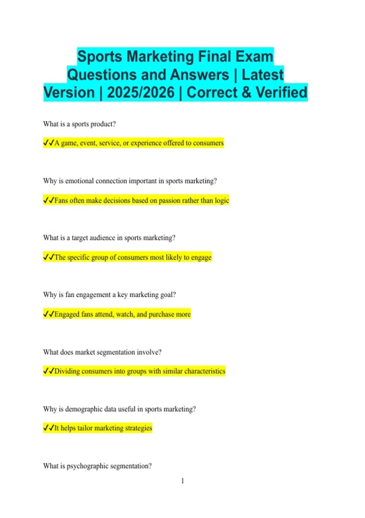 Sports Marketing Final Exam Questions and Answers | Latest Version | 2025/2026 | Correct & Verified What is a sports product? A game, event, service, or experience offered to consumers Why is emotional connection important in sports marketing? Fans often make decisions based on passion rather than logic What is a target audience in sports marketing? The specific group of consumers most likely to engage Why is fan engagement a key marketing goal? Engaged fans attend, watch, and purchase more What does market segmentation involve? Dividing consumers into groups with similar characteristics Why is demographic data useful in sports marketing? It helps tailor marketing strategies What is psychographic segmentation? 2 Grouping consumers by lifestyle, values, and interests Why is pricing strategy important in sports? It affects demand, revenue, and fan access What is dynamic pricing? Adjusting prices based on demand and timing Why are ticket sales considered core revenue? They directly fund operations and events What is secondary ticket market? Resale of tickets by third parties Why do teams use promotional giveaways? To increase attendance and brand awareness What is sponsorship in sports marketing? A business partnership providing financial or material support Why do companies sponsor sports teams or events? To gain exposure and brand association 3 What is sponsorship activation? Using marketing efforts to maximise sponsor value Why is naming rights sponsorship valuable? It provides long-term brand visibility What is endorsement marketing? Using athletes or celebrities to promote products Why is athlete credibility important in endorsements? Trust increases consumer influence What is sports merchandising? Selling branded apparel and products Why is logo design important in sports marketing? It represents identity and recognition What is brand equity in sports? The value of a brand based on consumer perception 4 Why is social media important in sports marketing? It allows direct and real-time fan interaction What is content marketing in sports? Sharing engaging stories, videos, and updates Why do sports organisations use storytelling? Stories deepen emotional fan connections What is experiential marketing in sports? Creating memorable fan experiences Why are fan events important for marketing? They strengthen relationships with supporters What is relationship marketing? Building long-term customer connections Why is customer retention more valuable than acquisition? Returning fans cost less to market to What is a marketing mix in sports?