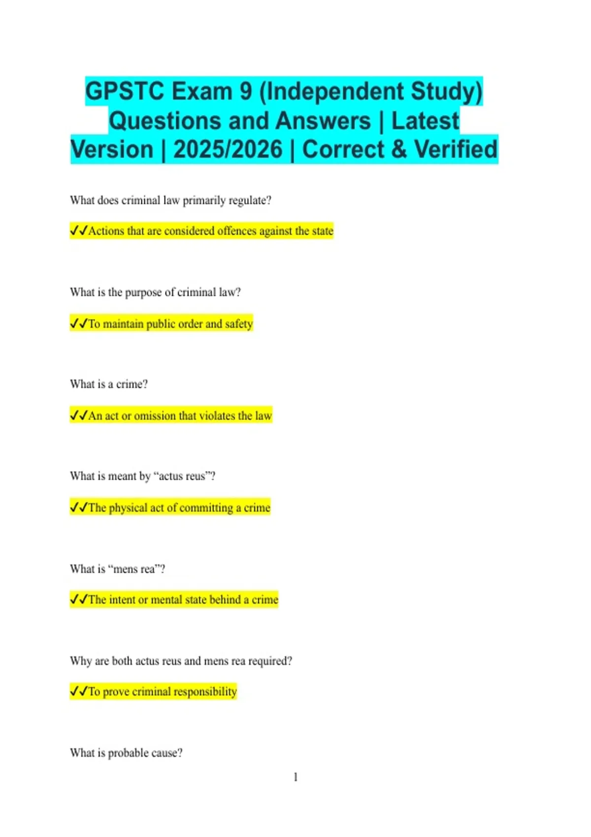 GPSTC Exam 9 (Independent Study) Questions and Answers | Latest Version | 2025/2026 | Correct & Verified What does criminal law primarily regulate? Actions that are considered offences against the state What is the purpose of criminal law? To maintain public order and safety What is a crime? An act or omission that violates the law What is meant by “actus reus”? The physical act of committing a crime What is “mens rea”? The intent or mental state behind a crime Why are both actus reus and mens rea required? To prove criminal responsibility What is probable cause? 2 Reasonable belief that a crime has occurred What is a felony? A serious criminal offence What is a misdemeanor? A less serious criminal offence What is an arrest? The taking of a person into legal custody What is a warrant? A legal document authorising police action Who issues a warrant? A judge or magistrate What is a lawful search? A search permitted by law What does the Fourth Amendment protect? Freedom from unreasonable searches and seizures 3 What is reasonable suspicion? A belief based on facts that criminal activity is occurring What is Miranda warning? A statement of rights given to a suspect Why must Miranda rights be read? To protect the suspect’s Fifth Amendment rights What is self-incrimination? Giving evidence against oneself What does due process mean? Fair treatment through the legal system What is double jeopardy? Being tried twice for the same crime What is a confession? An admission of guilt 4 What is an alibi? A claim of being elsewhere when a crime occurred What is probable cause used for? To justify arrests and searches What is an indictment? A formal charge by a grand jury What is a plea bargain? An agreement to plead guilty for a lesser charge What is the burden of proof in criminal cases? Beyond a reasonable doubt What is an arraignment? The first court appearance of the accused What is bail? Money paid for temporary release
