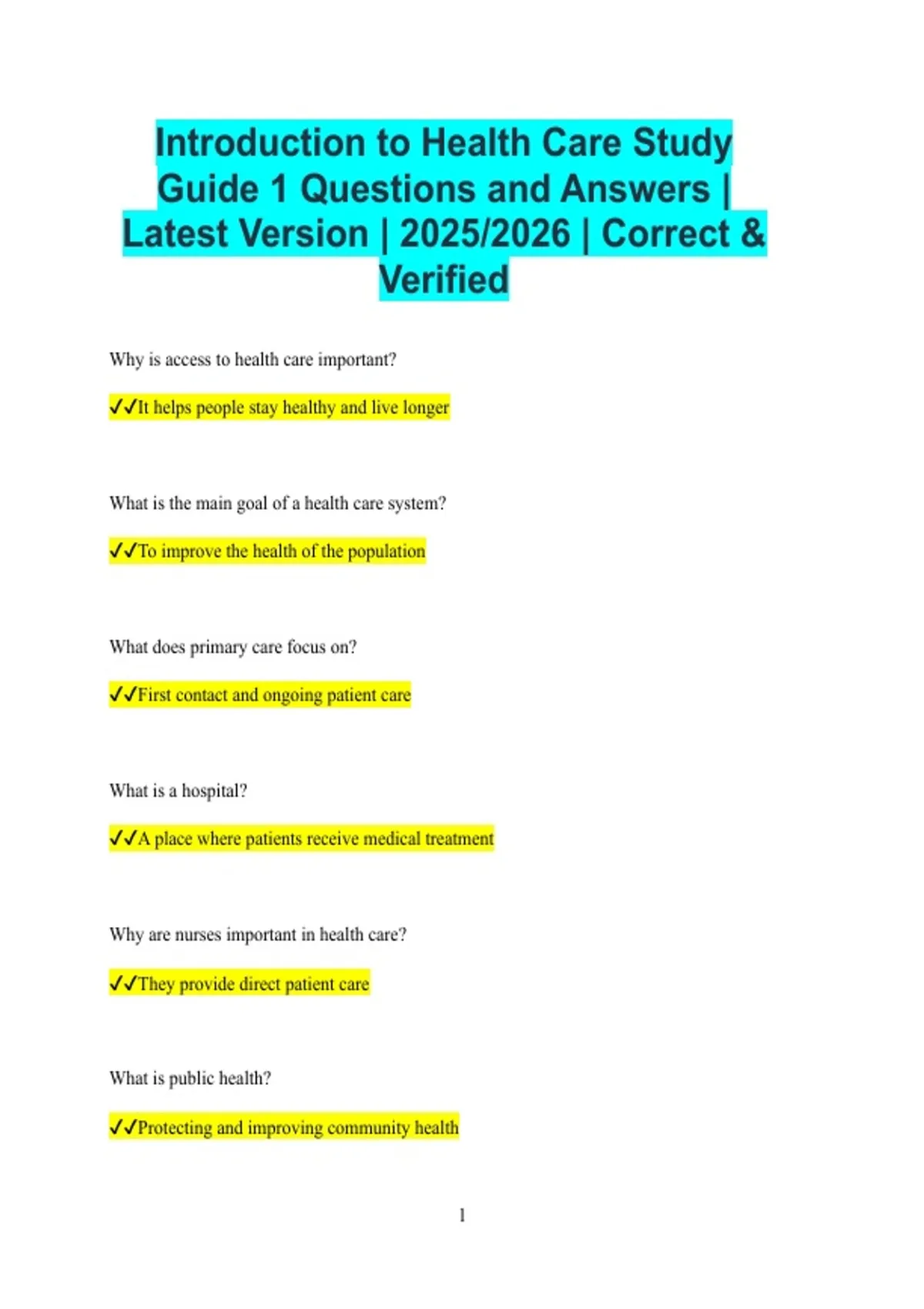 Introduction to Health Care Study Guide 1 Questions and Answers | Latest Version | 2025/2026 | Correct & Verified Why is access to health care important? It helps people stay healthy and live longer What is the main goal of a health care system? To improve the health of the population What does primary care focus on? First contact and ongoing patient care What is a hospital? A place where patients receive medical treatment Why are nurses important in health care? They provide direct patient care What is public health? Protecting and improving community health 2 What does a physician do? Diagnoses and treats illness Why is prevention important in health care? It reduces disease and costs What is health insurance? Coverage that helps pay medical costs Why are medical records important? They document patient care What is patient-centred care? Care focused on patient needs Why is teamwork important in health care? Many professionals provide care What is a clinic? A place for outpatient care What is emergency care? 3 Immediate treatment for serious conditions Why is confidentiality important? It protects patient privacy What is informed consent? Patient agreement after understanding care What does a pharmacist do? Dispenses medications What is a diagnosis? Identification of illness Why is health education important? It helps people make healthy choices What is a health care provider? A person who delivers care Why is communication important in health care? It improves safety and understanding 4 What is patient safety? Protecting patients from harm What is a treatment plan? A plan for patient care Why is follow-up care needed? To monitor recovery What is a specialist? A provider with advanced training Why is documentation necessary? It records care given What is rehabilitation? Helping patients regain function Why is mental health care important?