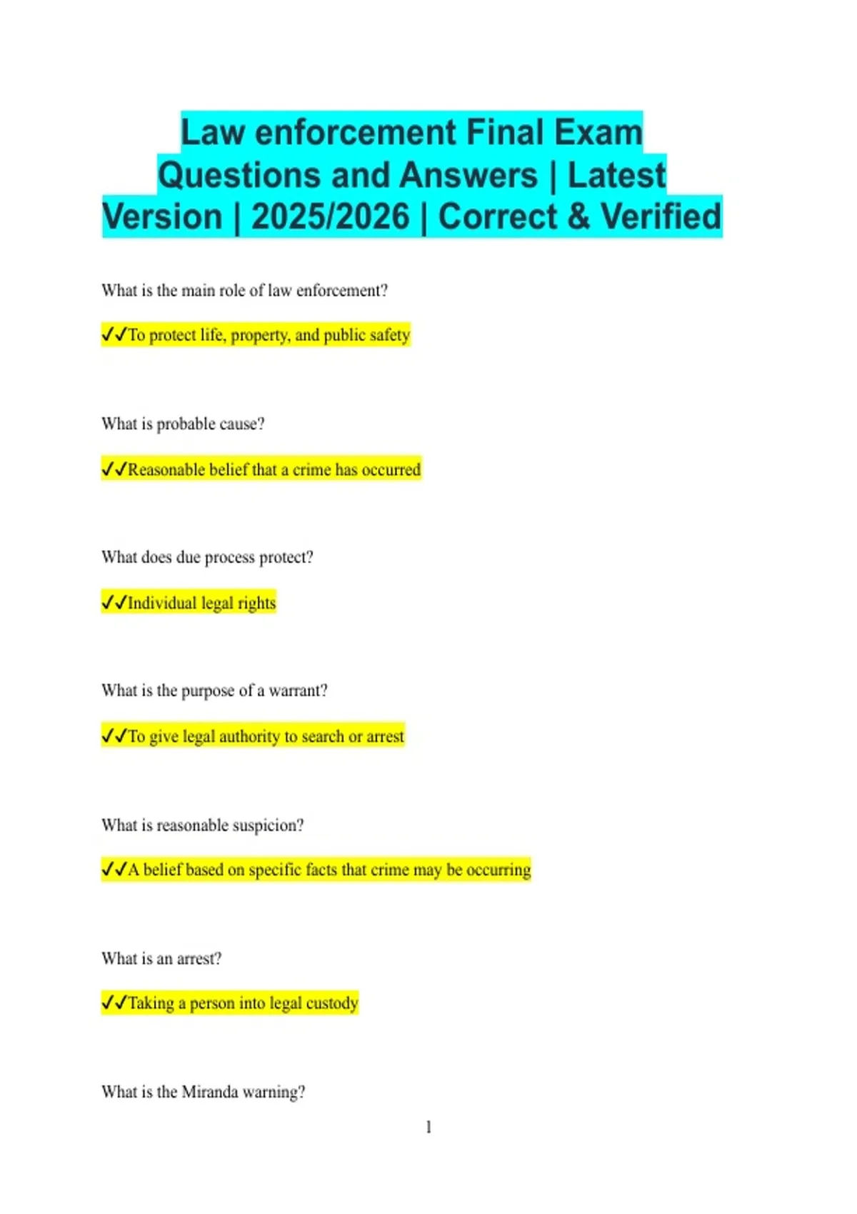 Law enforcement Final Exam Questions and Answers | Latest Version | 2025/2026 | Correct & Verified What is the main role of law enforcement? To protect life, property, and public safety What is probable cause? Reasonable belief that a crime has occurred What does due process protect? Individual legal rights What is the purpose of a warrant? To give legal authority to search or arrest What is reasonable suspicion? A belief based on specific facts that crime may be occurring What is an arrest? Taking a person into legal custody What is the Miranda warning? 2 A statement of rights given to suspects Why must Miranda rights be read? To protect against self-incrimination What is a felony? A serious criminal offense What is a misdemeanor? A less serious crime What is community policing? Building partnerships with the public What is use of force? Physical action to control a suspect What is excessive force? Force beyond what is necessary What is a patrol officer’s main duty? To maintain public order 3 What is a search? Looking for evidence What is seizure? Taking control of property or a person What is chain of custody? Record of evidence handling What is evidence? Information used to prove a case What is hearsay? Secondhand information What is an affidavit? A sworn written statement What is a subpoena? Order to appear in court 4 What is jurisdiction? Legal authority in a specific area What is a crime scene? Location where a crime occurred What is forensic science? Use of science in criminal investigations What is fingerprinting? Identifying people by finger patterns What is DNA evidence? Biological material used for identification What is an alibi? Proof a person was elsewhere What is an interrogation? Questioning a suspect What is a lineup? 5 Group used for witness identification What is a police report? Written record of an incident What is domestic violence? Abuse within a family or relationship What is a restraining order?