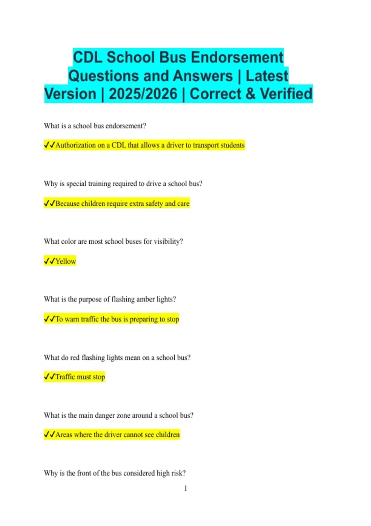 CDL School Bus Endorsement Questions and Answers | Latest Version | 2025/2026 | Correct & Verified What is a school bus endorsement? Authorization on a CDL that allows a driver to transport students Why is special training required to drive a school bus? Because children require extra safety and care What color are most school buses for visibility? Yellow What is the purpose of flashing amber lights? To warn traffic the bus is preparing to stop What do red flashing lights mean on a school bus? Traffic must stop What is the main danger zone around a school bus? Areas where the driver cannot see children Why is the front of the bus considered high risk? 2 Children may cross there What is the crossing arm used for? To keep students at a safe distance in front of the bus What should a driver do before students cross the road? Make sure all traffic has stopped Why is mirror adjustment important? To see students around the bus What is the purpose of a pre-trip inspection? To ensure the bus is safe to drive Why must emergency exits be checked? To make sure they work in emergencies What is the role of a bus driver at a stop? To protect students while boarding and leaving Why is counting students important? To ensure none are missing or left behind 3 What is the safest way for students to cross in front of the bus? When the driver signals it is safe Why must the bus remain stopped until students are seated? To prevent injuries What is required when approaching a railroad crossing? Stopping and checking for trains Why should radios and fans be turned off at crossings? To hear approaching trains What should a driver do if a train is coming? Remain stopped What is the purpose of evacuation drills? To prepare students for emergencies Where should students go after evacuation? To a safe area away from traffic 4 Why is it important to use the safest exit during evacuation? Some exits may be blocked What should a driver do if the bus breaks down? Secure the bus and call for help Why are reflectors used on the road? To warn other drivers What is the main purpose of hazard lights? To alert others of a stopped bus Why must the parking brake be set during stops? To prevent the bus from rolling What is the correct position of the steering wheel