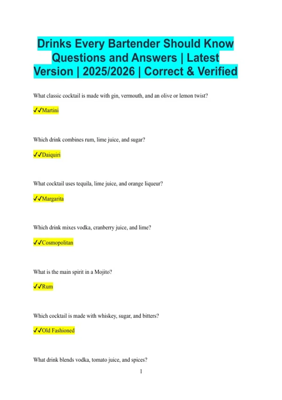 Drinks Every Bartender Should Know Questions and Answers | Latest Version | 2025/2026 | Correct & Verified What classic cocktail is made with gin, vermouth, and an olive or lemon twist? Martini Which drink combines rum, lime juice, and sugar? Daiquiri What cocktail uses tequila, lime juice, and orange liqueur? Margarita Which drink mixes vodka, cranberry juice, and lime? Cosmopolitan What is the main spirit in a Mojito? Rum Which cocktail is made with whiskey, sugar, and bitters? Old Fashioned What drink blends vodka, tomato juice, and spices? 2 Bloody Mary Which cocktail includes gin, lemon juice, sugar, and soda? Tom Collins What drink is made from rum, mint, lime, sugar, and soda? Mojito Which classic cocktail uses bourbon, mint, and sugar? Mint Julep What is the base spirit of a Negroni? Gin Which drink combines gin, Campari, and sweet vermouth? Negroni What cocktail uses vodka and coffee liqueur? Black Russian What drink adds cream to a Black Russian? White Russian 3 Which cocktail mixes rum, cola, and lime? Cuba Libre What drink contains whiskey, lemon juice, and sugar? Whiskey Sour Which cocktail is made with champagne and orange juice? Mimosa What drink uses peach purée and sparkling wine? Bellini Which cocktail combines vodka, ginger beer, and lime? Moscow Mule What drink is made with tequila and grapefruit soda? Paloma Which cocktail includes rum, pineapple juice, and coconut cream? Piña Colada 4 What drink is known for vodka, triple sec, and cranberry juice? Cosmopolitan Which cocktail uses gin, lemon juice, and honey? Bee’s Knees What is the main ingredient in a Manhattan? Whiskey Which drink uses whiskey and sweet vermouth with bitters? Manhattan