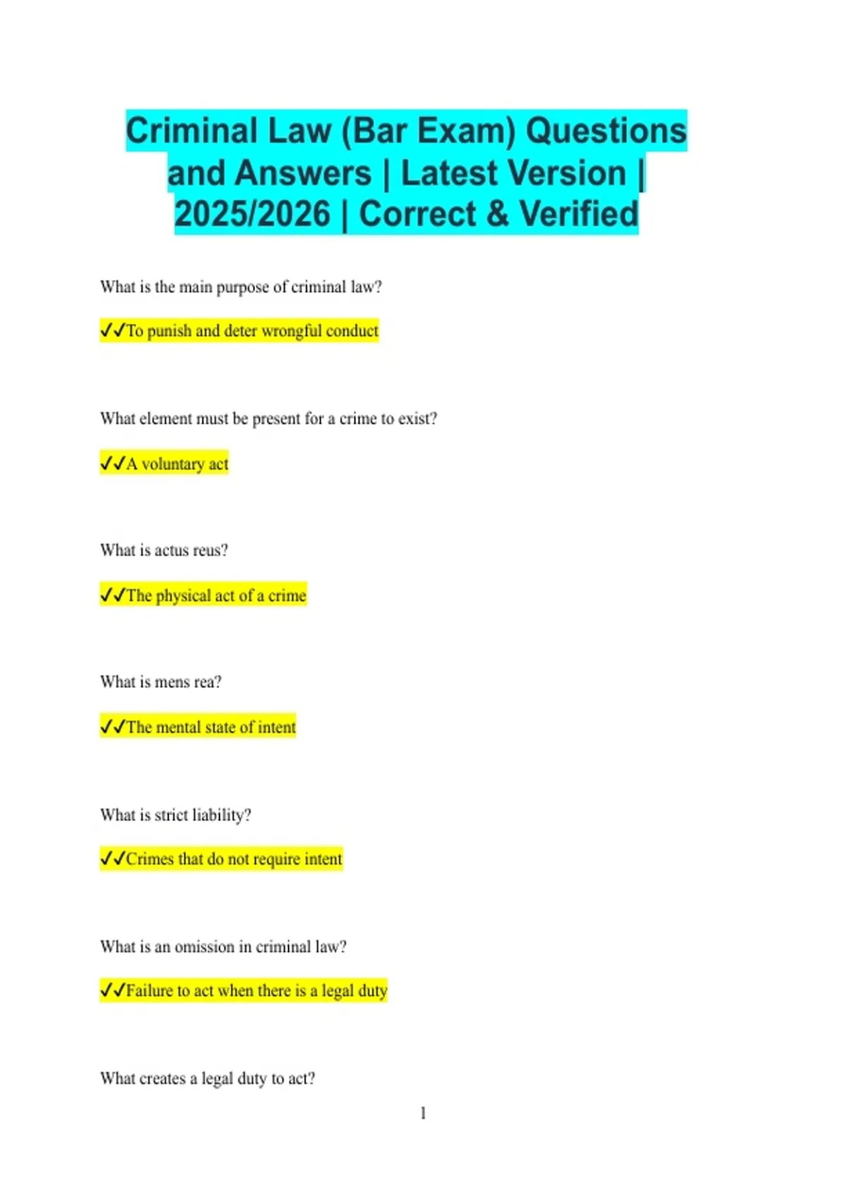 Criminal Law (Bar Exam) Questions and Answers | Latest Version | 2025/2026 | Correct & Verified What is the main purpose of criminal law? To punish and deter wrongful conduct What element must be present for a crime to exist? A voluntary act What is actus reus? The physical act of a crime What is mens rea? The mental state of intent What is strict liability? Crimes that do not require intent What is an omission in criminal law? Failure to act when there is a legal duty What creates a legal duty to act? 2 A special relationship or statute What is causation in criminal law? Link between act and harm What is proximate cause? The direct connection to the harm What is concurrence? The act and intent occur together What is transferred intent? Intent moves from intended to actual victim What is a general intent crime? Crime requiring only intent to do the act What is a specific intent crime? Crime requiring intent to cause a particular result What is malice aforethought? Intent to kill or cause serious harm 3 What is first-degree murder? Premeditated and deliberate killing What is second-degree murder? Intentional killing without premeditation What is voluntary manslaughter? Killing in the heat of passion What is involuntary manslaughter? Unintentional killing due to negligence What is felony murder? Death occurring during a felony What is an accomplice? A person who helps commit a crime What is aiding and abetting? Helping another commit a crime 4 What is solicitation? Encouraging someone to commit a crime What is conspiracy? Agreement to commit a crime What is attempt? Taking steps toward committing a crime What is impossibility? When a crime cannot be completed What is a defense of mistake of fact? Belief that negates intent What is self-defense? Using force to protect oneself