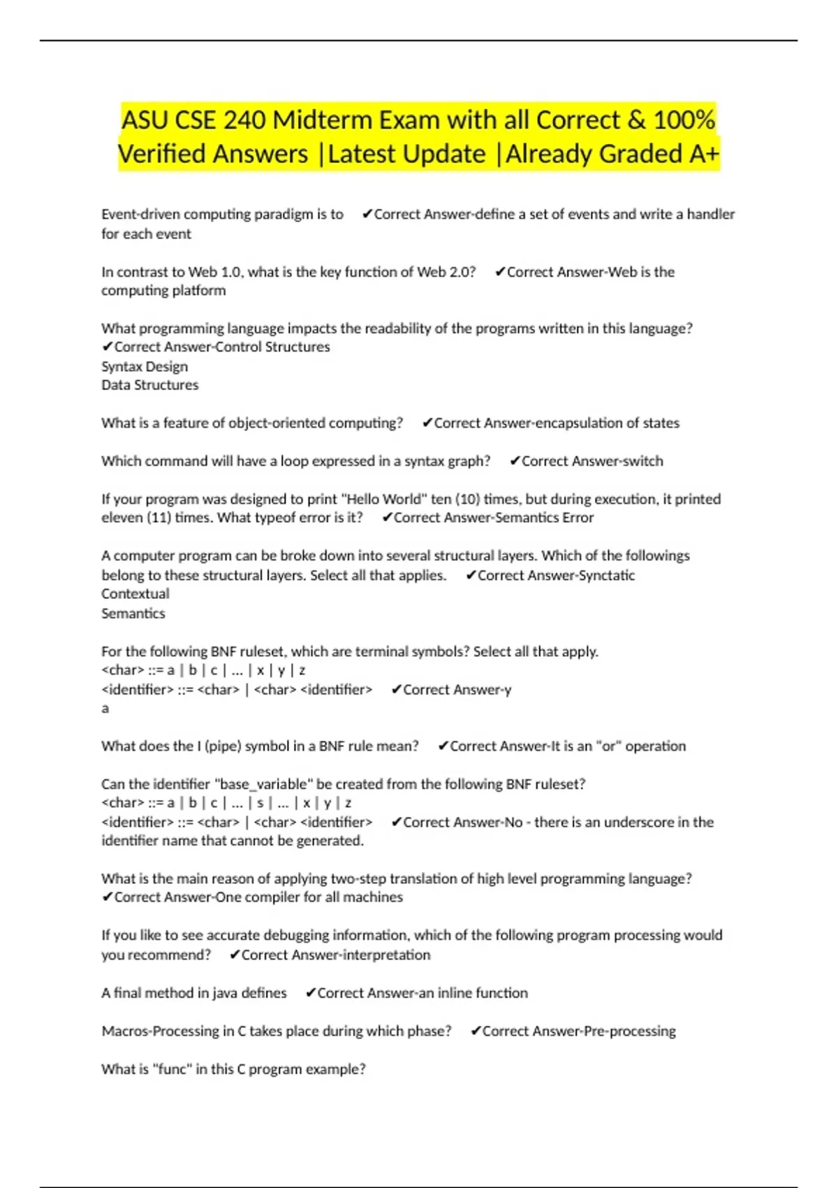 ASU CSE 240 Midterm Exam with all Correct & 100% Verified Answers |Latest Update |Already Graded A+