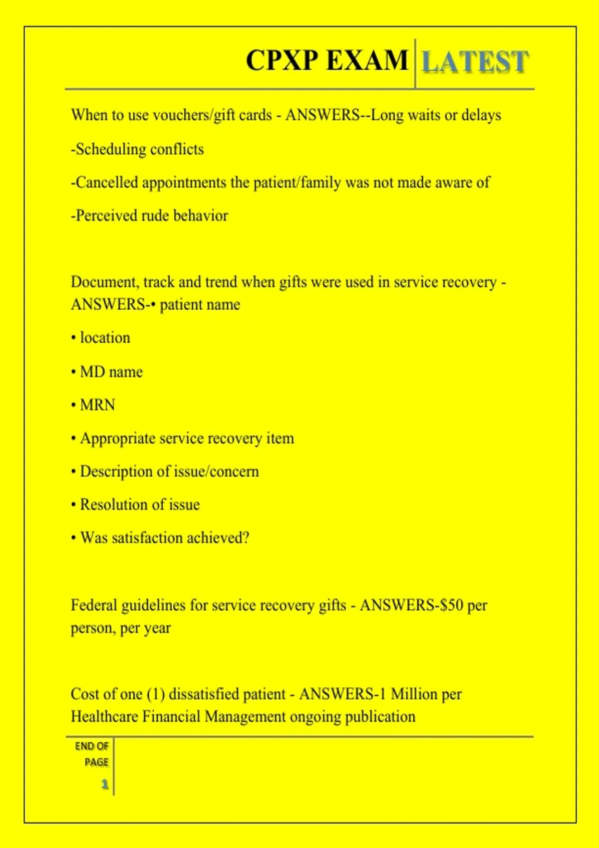 Cost of one (1) dissatisfied patient - ANSWERS-1 Million per