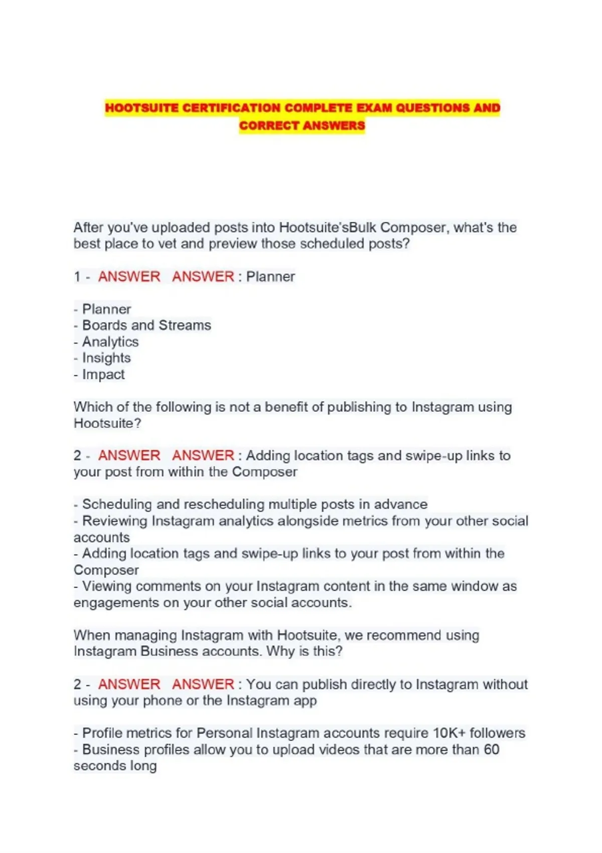 HOOTSUITE CERTIFICATION COMPLETE EXAM QUESTIONS AND CORRECT ANSWERS...