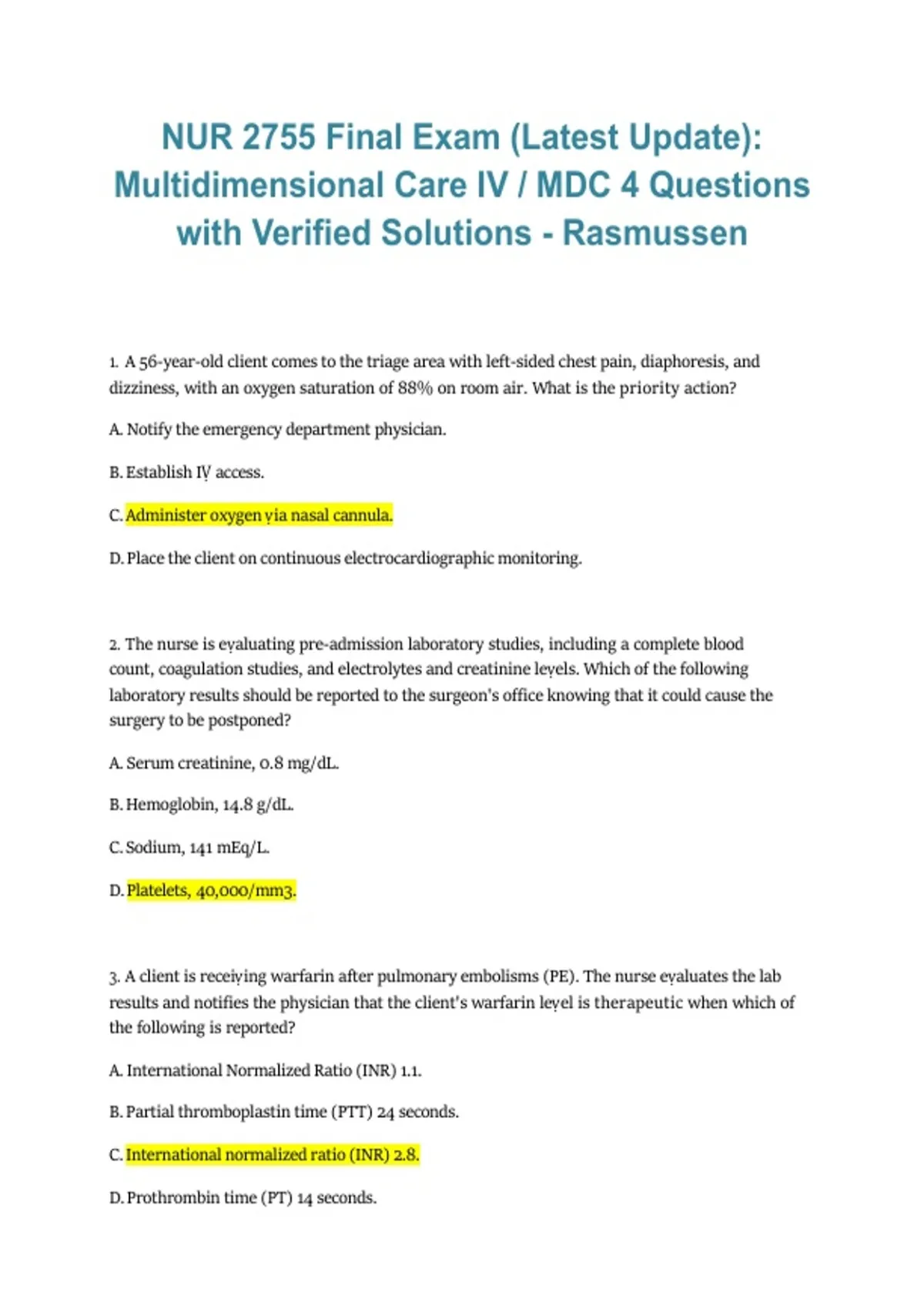 This document provides the latest updated NUR 2755 (Multidimensional Care IV / MDC 4) final exam questions with fully verified solutions for Rasmussen University. It covers advanced clinical concepts, nursing interventions, patient care priorities, and critical-thinking scenarios assessed throughout the course. The material is designed for comprehensive review, self-testing, and confident final exam preparation.