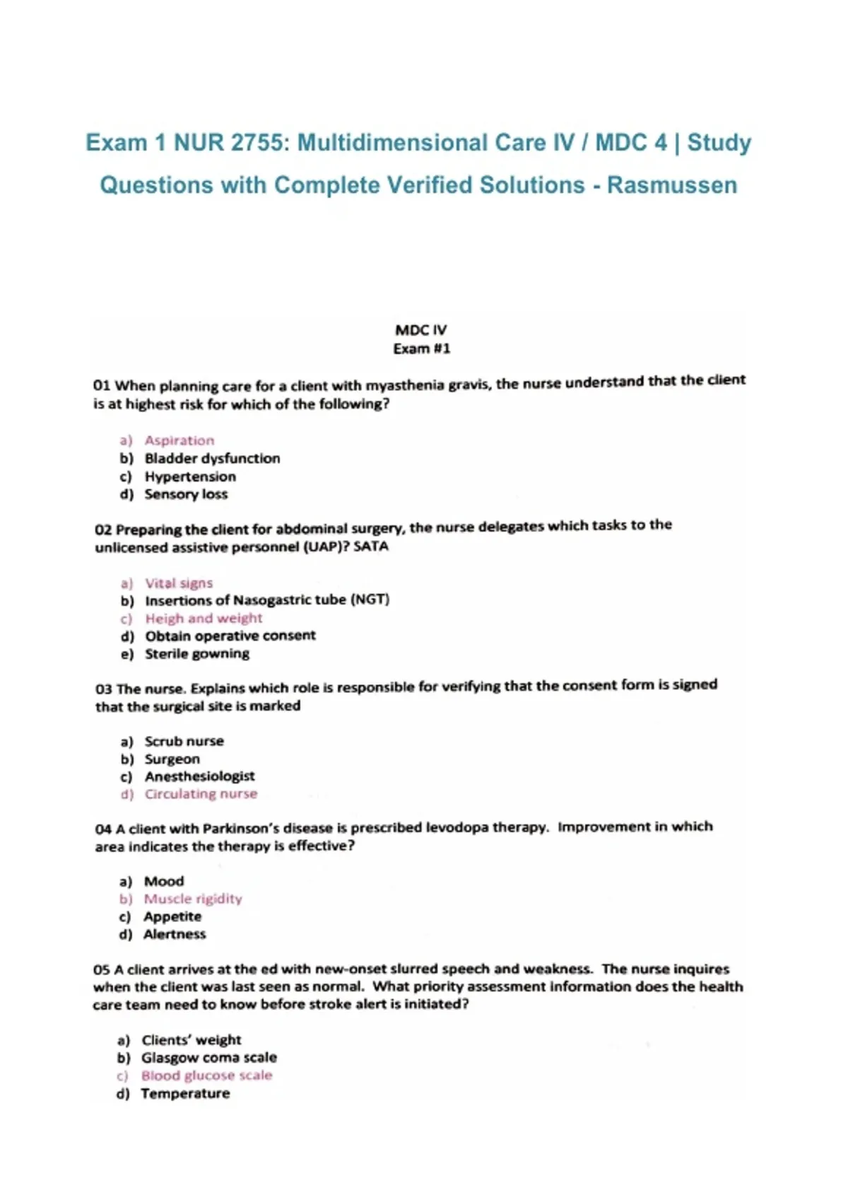 This document provides a comprehensive study guide for NUR 2755 (Multidimensional Care IV / MDC 4) Exam 1 at Rasmussen University, featuring exam-style questions with complete and fully verified solutions. It covers essential advanced nursing concepts, patient assessments, clinical decision-making, and priority-setting scenarios commonly tested in Exam 1. The material is structured for effective revision, self-testing, and confident exam preparation.