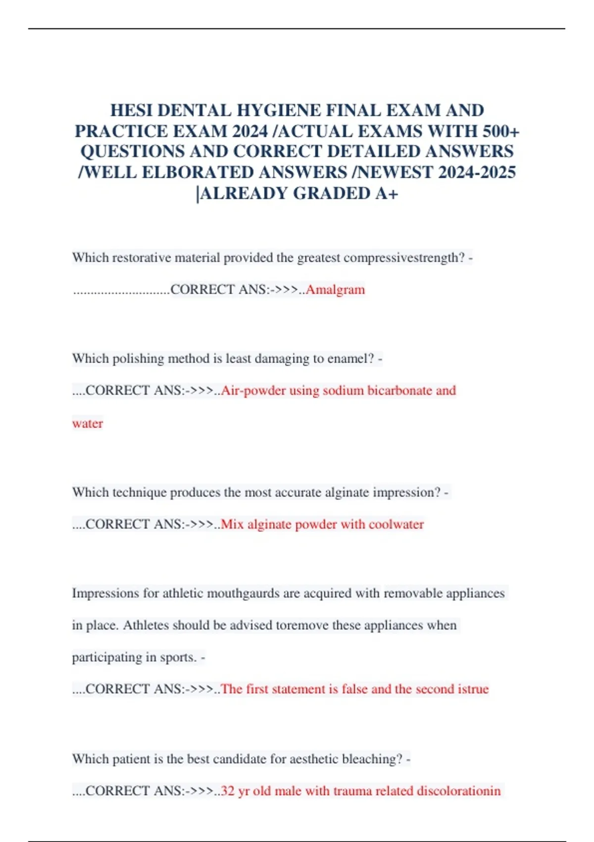HESI DENTAL HYGIENE FINAL EXAM AND PRACTICE EXAM 2024 /ACTUAL EXAMS WITH 500+ QUESTIONS AND CORRECT DETAILED ANSWERS /WELL ELBORATED ANSWERS /NEWEST |ALREADY GRADED A+