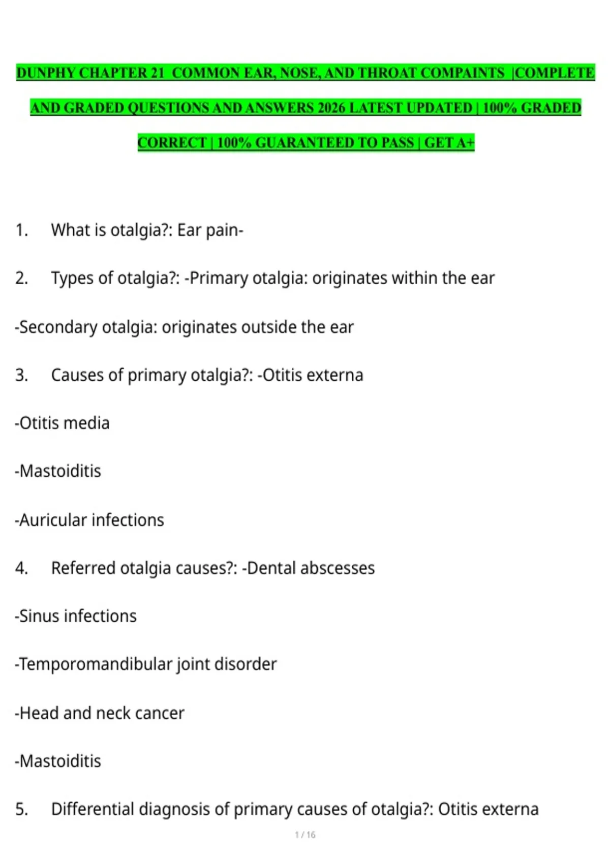 DUNPHY CHAPTER 21 COMMON EAR, NOSE, AND THROAT COMPAINTS |COMPLETE AND GRADED QUESTIONS AND ANSWERS 2026 LATEST UPDATED | 100% GRADED CORRECT | 100% GUARANTEED TO PASS | GET A+