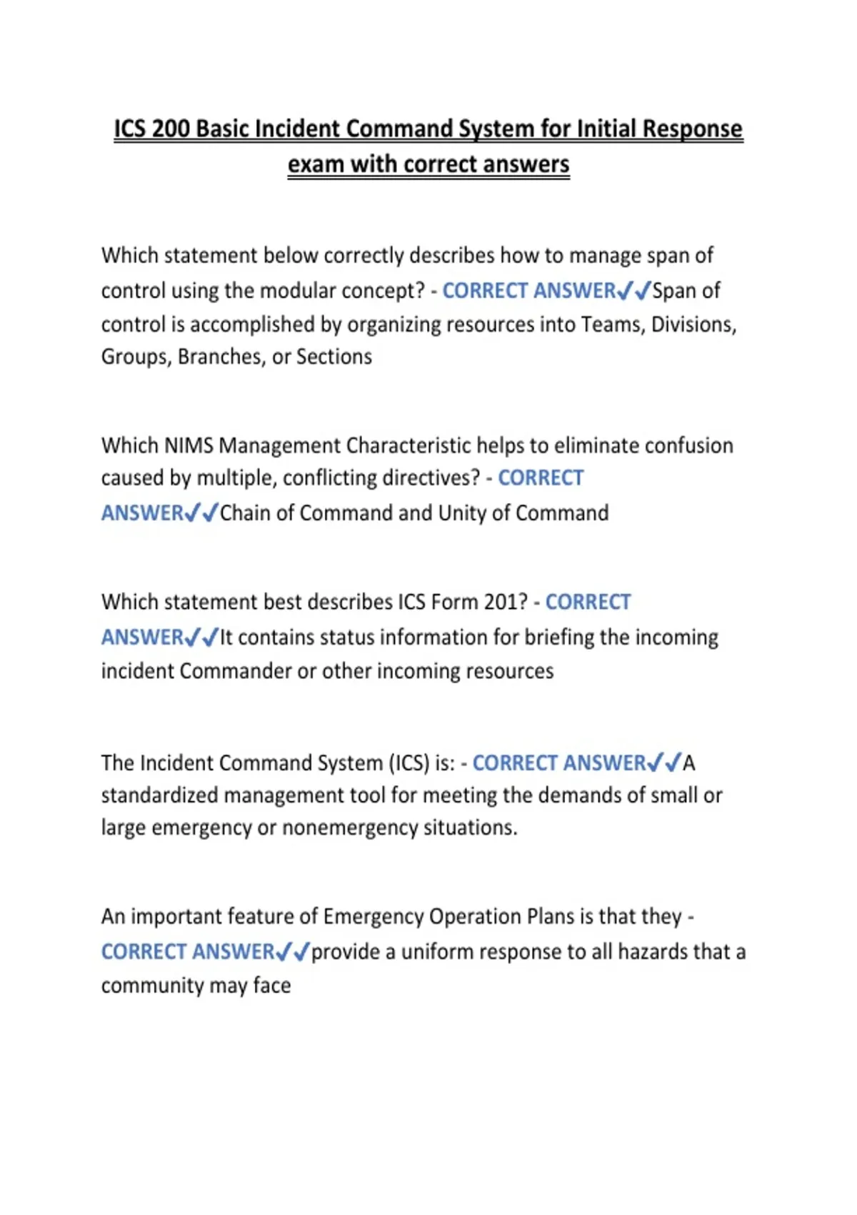 Prepare effectively for the ICS 200 Basic Incident Command System for Initial Response exam with this comprehensive PDF. This study guide includes all exam questions with accurate, verified answers, helping you understand key ICS concepts, roles, and procedures for initial incident response. Ideal for students, emergency responders, and professionals seeking to master the ICS 200 framework, improve test performance, and boost confidence in emergency management scenarios. Access a complete, easy-to-use exam preparation resource in one downloadable PDF.
