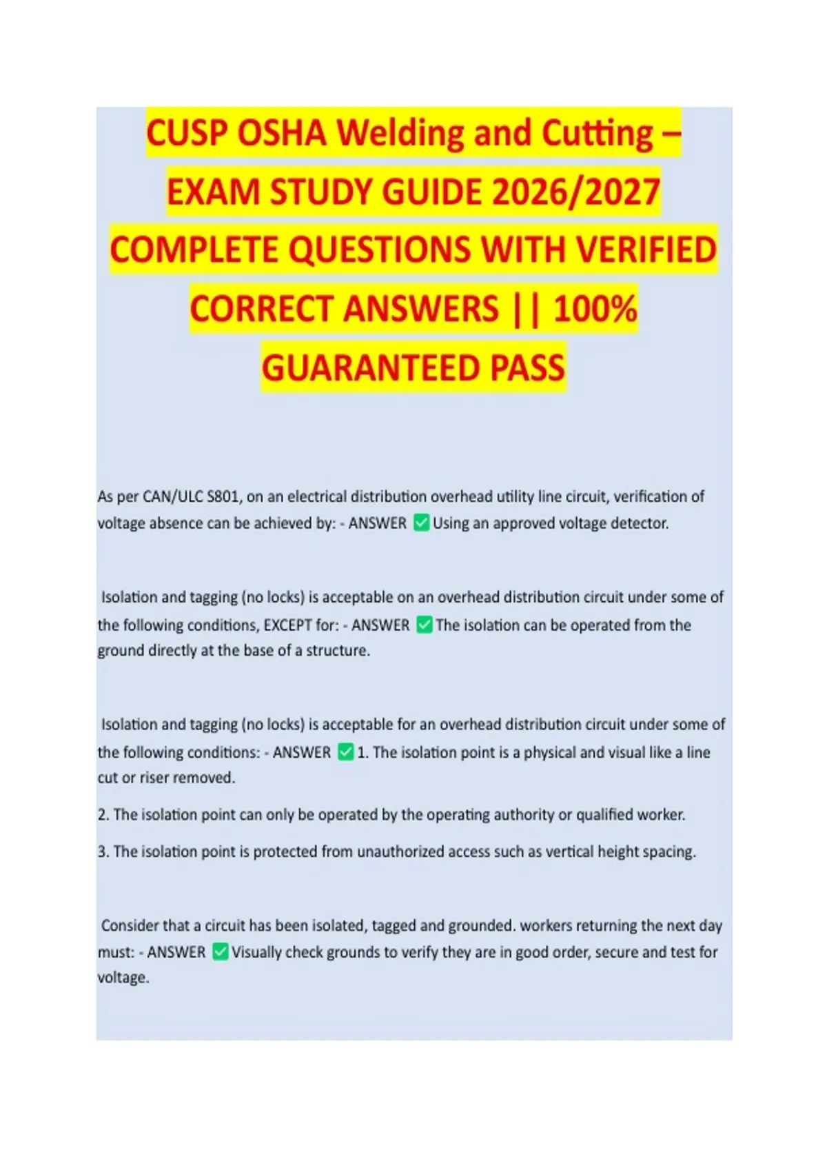 CUSP OSHA Welding and Cutting – EXAM STUDY GUIDE 2026/2027 COMPLETE QUESTIONS WITH VERIFIED CORRECT ANSWERS || 100% GUARANTEED PASS <NEWEST VERSION>