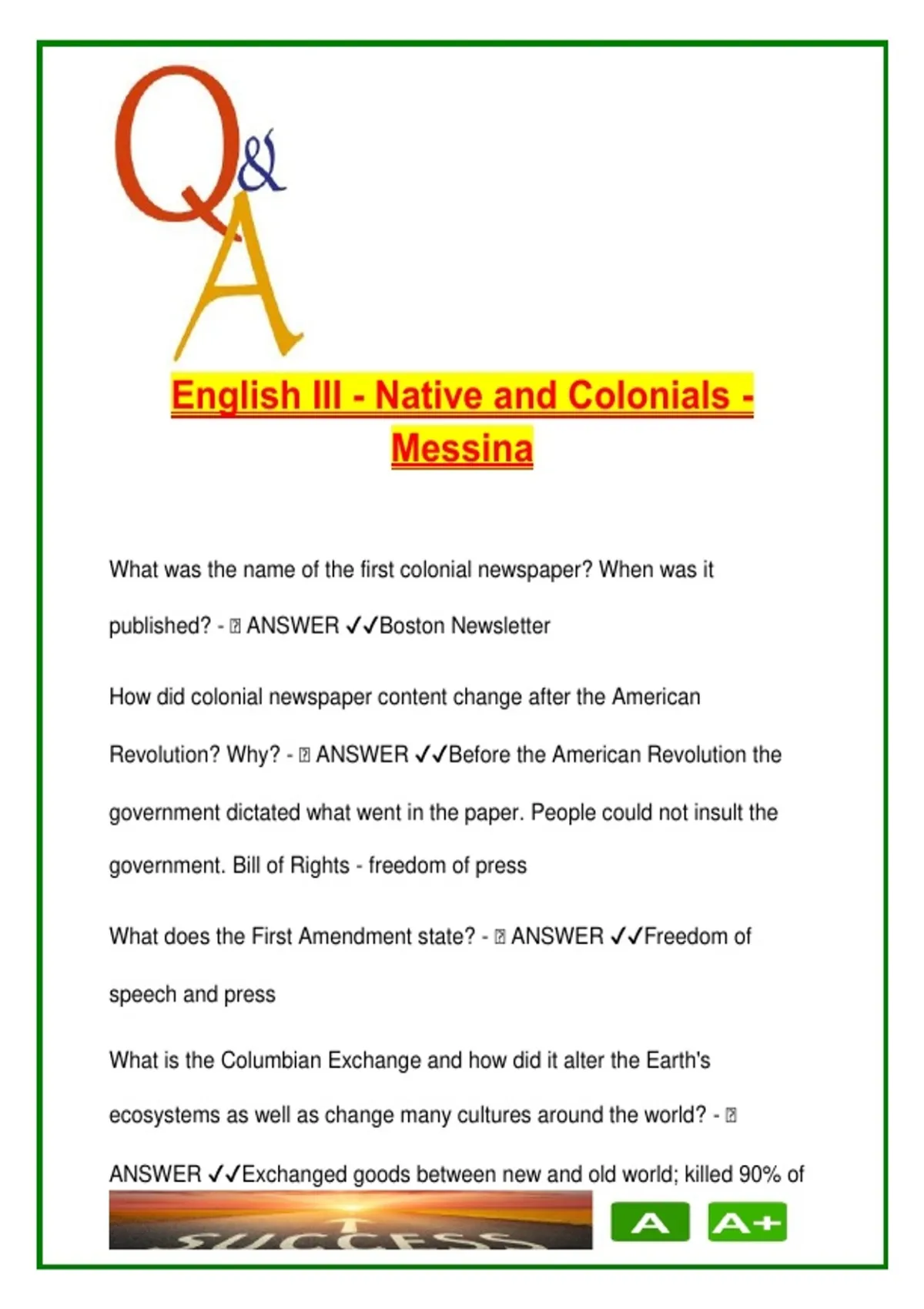 This document provides an in-depth, fully structured study guide for English III, focused on early American literature with over 100 questions and answers covering Native American myths, colonial narratives, religious influences, and author analysis. It explores key cultural, historical, and literary developments foundational to understanding pre- and early colonial American writing. Key sections include: Native American culture and philosophy: Oral traditions, the sacredness of nature, creation myths such as The World on the Turtle’s Back, and trickster tales like Coyote and the Buffalo Colonial experience: Impact of the Columbian Exchange, Native-European conflicts, and the development of colonial media (e.g., the Boston Newsletter) Religious influence: The role of Puritans and Separatists, plain style writing, the Great Awakening, and theological differences among settlers Key authors: Focused study of William Bradford and Johnathan Edwards for the Puritan worldview, and William Byrd as a representative Southern Planter using satire and Enlightenment ideas Comparison of cultures: Contrasts between Puritan and Southern planter ideologies, religious tolerance, and literary tone and purpose The document integrates literary concepts such as tone, diction, satire, extended metaphor, archetype, and symbolism, providing excellent contextual grounding for literary analysis. This resource is perfect for: Students in English III, AP English Language, or American Literature Learners preparing for unit tests, midterms, or thematic essays Classroom discussions on early American values, literary movements, and foundational texts Keywords: Native American literature, creation myths, oral tradition, trickster tales, Iroquois, The World on the Turtle’s Back, Columbian Exchange, Puritanism, Separatists, William Bradford, Great Awakening, Johnathan Edwards, plain style, Southern Planters, William Byrd, satire, The History of the Dividing Line, Puritan vs Cavalier, religious conflict, tone, diction, archetypes, extended metaphor, colonial writing, American identity