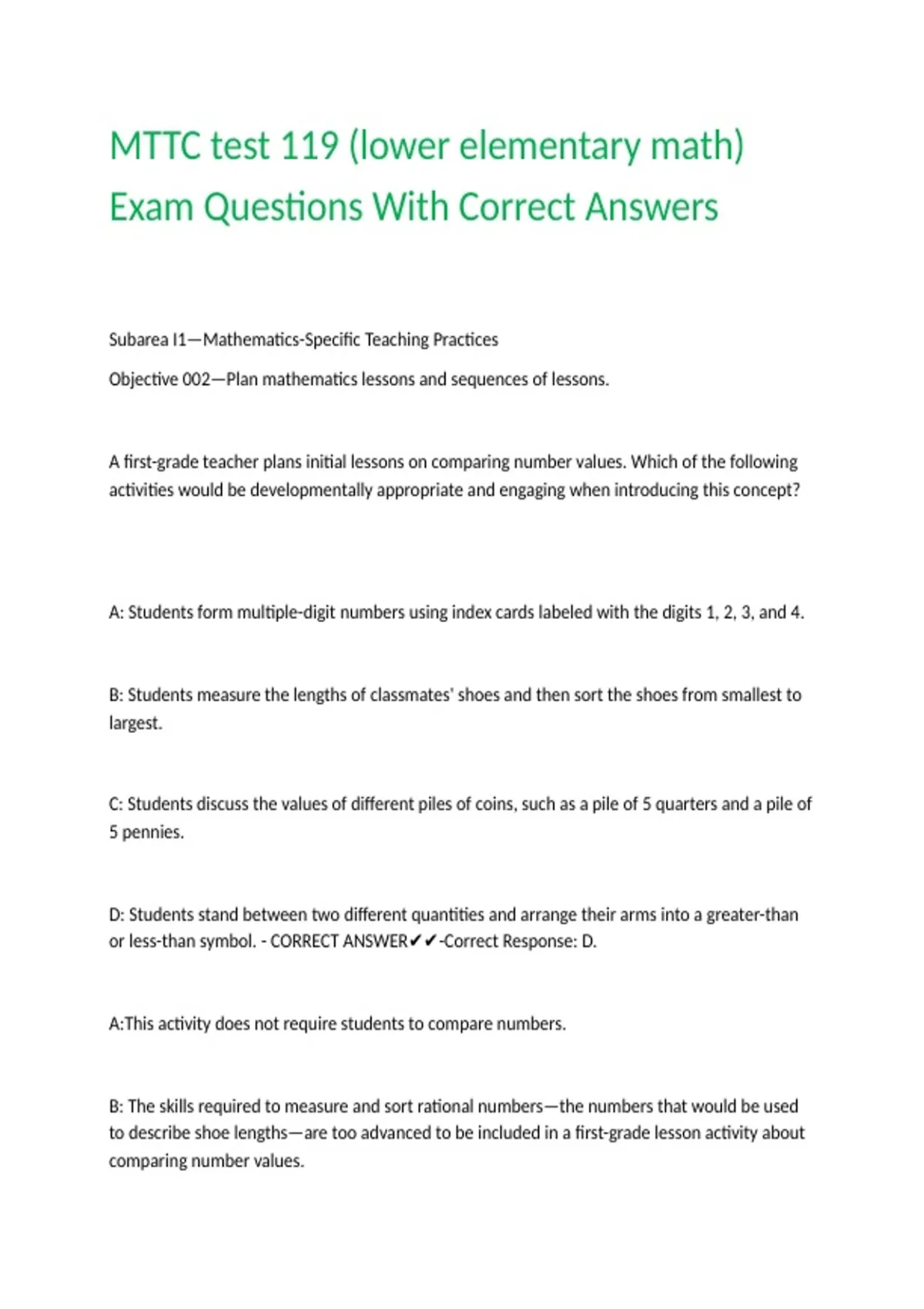 MTTC test 119 (lower elementary math) Exam Questions With Correct Answers