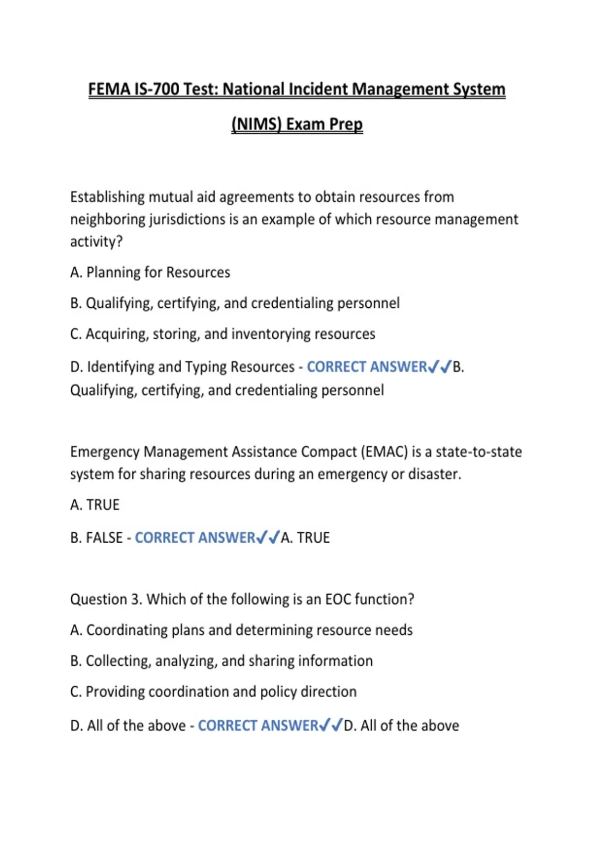 Ace the FEMA IS-700 National Incident Management System (NIMS) exam with this complete test prep PDF. Includes all essential concepts, verified answers, and practical exam questions to help students, first responders, and emergency management professionals master NIMS principles, ICS roles, and incident management procedures. Perfect for exam preparation or reinforcing real-world emergency response knowledge, this guide provides a structured, easy-to-follow resource to boost confidence and ensure success in FEMA IS-700 certification.