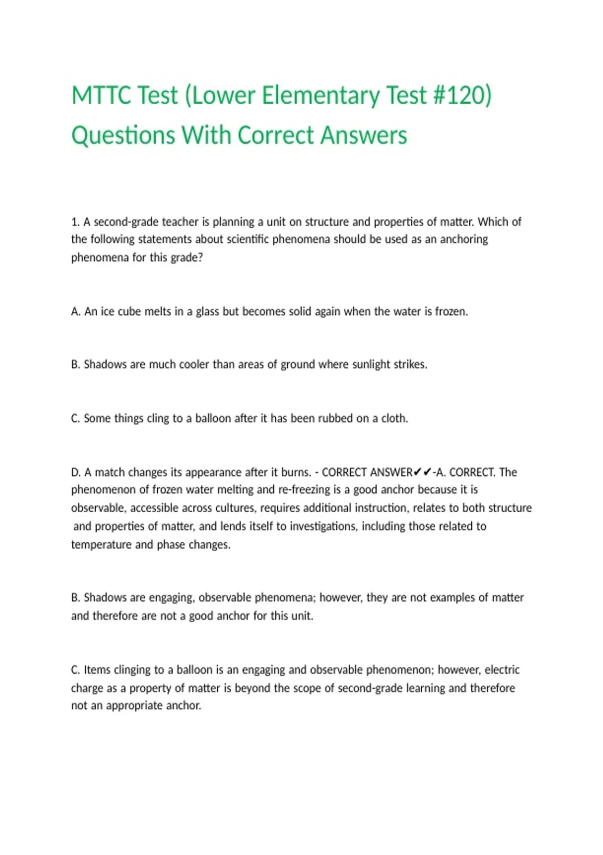 MTTC Test (Lower Elementary Test -120) Questions With Correct Answers