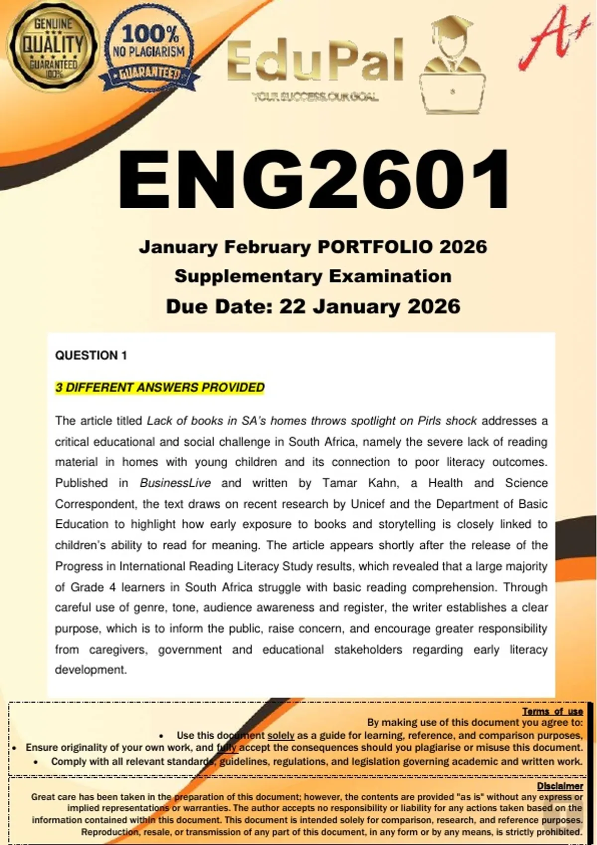 ENG2601 January/February Supplementary Portfolio (COMPLETE ANSWERS) 2026 - DUE 22 January 2026; 100% TRUSTED Complete, trusted solutions and explanations. For assistance, Whats-App 0.6.7-1.7.1-1.7.3.9. Ensure your success with us... Jan/Feb 2026 ENG2601 Applied English Language Studies: Further Explorations 100 marks 72 hours (3 days) Read Text A and answer the questions that follows. Lack of books in SA’s homes throws spotlight on Pirls shock No books in 43% of households with young children, according to research by Unicef by Tamar Kahn (Health & Science Correspondent) Read the text below and answer the question set. How South Africa can prepare for a data-driven education system Published: January 21, 2021 3.34pm SAST Authors: Mmaki Jantjies and Paul Plantinga le There are significant disparities in South Africa’s education system. Schools are divided into quintiles, from one to five; the poorest, in quintile one, struggle enormously with a lack of resources and support. They also tend to have poorer educational outcomes. That has a direct effect on university admission and outcomes. One of the government’s attempts to address these inequalities is through technology. This began as early as 2003 with the Draft White Paper on e-Education. These and similar policies aim to resource more marginalised schools, universities and colleges with digital tools. This, in a bid to “leapfrog” access to interactive learning content and improved administrative capabilities. COVID-19 lockdowns have made this approach “imperative … now the only thing we can do”, according to the country’s Ministry of Basic Education. More and more, data and data-driven tools are emerging as a central feature of this digital response. Developers of these technologies promise a new level of insight and automation that mimics human intelligence. They argue this will bring greater efficiency and effectiveness to both teaching and learning as well as to administrative processes. They suggest that performance dashboards, automated assessments, chat bots and adaptive learning technologies can mitigate many of the challenges faced by the country’s teachers, lecturers, district managers and university administrators. There’s a growing global evidence base to support these sorts of approaches. For instance, teachers in under-resourced schools with large classes could use technology to gather individualised data. With this they could develop more personalised learning experiences for pupils based on their strengths and weaknesses. Data is the backbone of these tools. The growth of machine learning and other intelligent applications has been spurred by the increased collection and availability of data. Such data underlies the kinds of adaptive applications and emerging technologies that are proposed for use in the education system. We collaborated on a guide that examines how South Africa can ensure its data policy and governance takes some of the lessons and concerns from previous education technology implementations into account. It also considers the practical steps needed for this to happen. The guide is part of a series curated by the Policy Action Network (PAN), a project by South Africa’s Human Sciences Research Council (HSRC). Here are some of the things a data policy for South Africa’s education system should consider. Technology impact Experience shows that simply providing technology to teachers or students has a limited effect on educational outcomes. The benefits of online, assisted learning and behavioural interventions also vary depending on how technology is used, and in what context. This is highlighted in working papers that review the effectiveness of educational technology globally and in developing countries. In South Africa, questions about effectiveness are amplified. That’s because of concerns about unequal Internet access. Cost-effectiveness and teacher perceptions are also issues. Data management A key issue centres on how data is collected, shared and used. It’s crucial that personal information should be kept private. Education institutions need to comply with the Protection of Personal Information Act (POPIA), which comes into force effect later in 2021. Another question concerns sharing and reuse across the wider spectrum of education data. This ranges from the content of books and journal articles to administrative data, such as student enrolments and graduations. Sharing or publishing this data in a responsible way can stimulate the development of many creative and useful applications. But data sharing intersects with evolving copyright laws and debates around ownership and reuse. These will have implications for data-driven innovation in the sector. A third point is to reckon with well-documented concerns about bias embedded in existing data which is being used in decision-support applications. If this isn’t dealt with, data-driven applications may reinforce historical prejudices and practices related to education. A holistic policy response South Africa doesn’t have to reinvent the wheel to deal with these issues. Other countries are exploring policy approaches that could guide or inform its approach. For instance, a governmental think tank in India developed a national artificial intelligence (AI) strategy. This points to various examples of how the country can use AI technologies to support education. Importantly, however, it also suggests replicating the UK’s Centre for Data Ethics and Innovation to ensure ethical and safe use of data. There are no books at all in 43% of SA households with young children, and just 16% of homes contain more than five books, according to research released on Monday by the UN children’s agency Unicef. The study highlights how reading and storytelling are neglected in many households and comes hard on the heels of results of the Progress in International Reading Literacy Study (Pirls) 2021, which found 81% of SA’s grade 4 ch