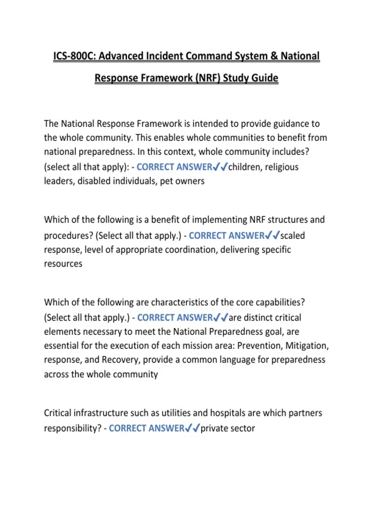 Prepare for the ICS-800C Advanced Incident Command System and National Response Framework (NRF) exam with this complete study guide PDF. Includes all essential concepts, verified answers, and detailed explanations to help students, first responders, and emergency management professionals master advanced ICS roles, NRF procedures, and national incident management strategies. Perfect for exam preparation or reinforcing practical emergency response knowledge, this structured guide ensures confidence and success in ICS-800C certification and national response planning.