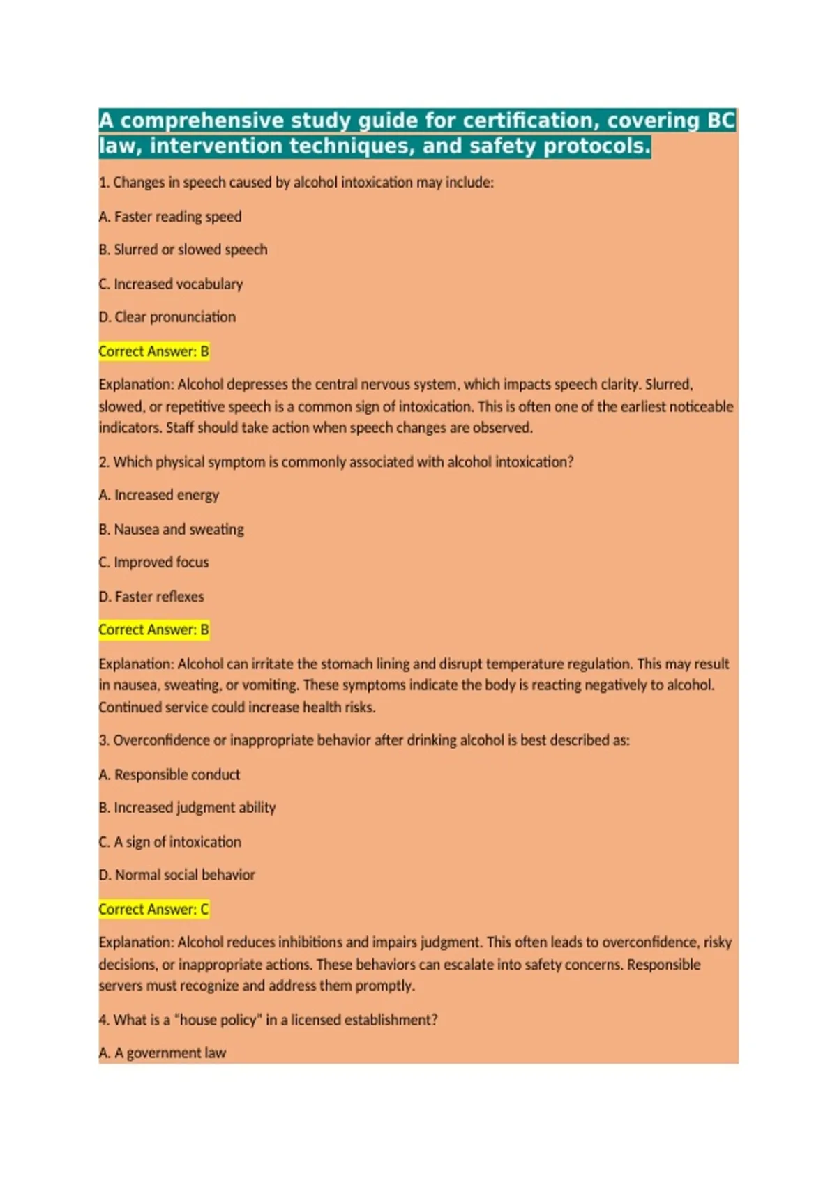 Explanation: A house policy is a written set of rules that guide staff in responsible beverage service. It