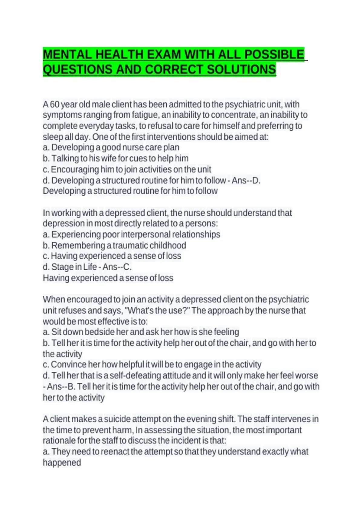 MENTAL HEALTH EXAM WITH ALL POSSIBLE
