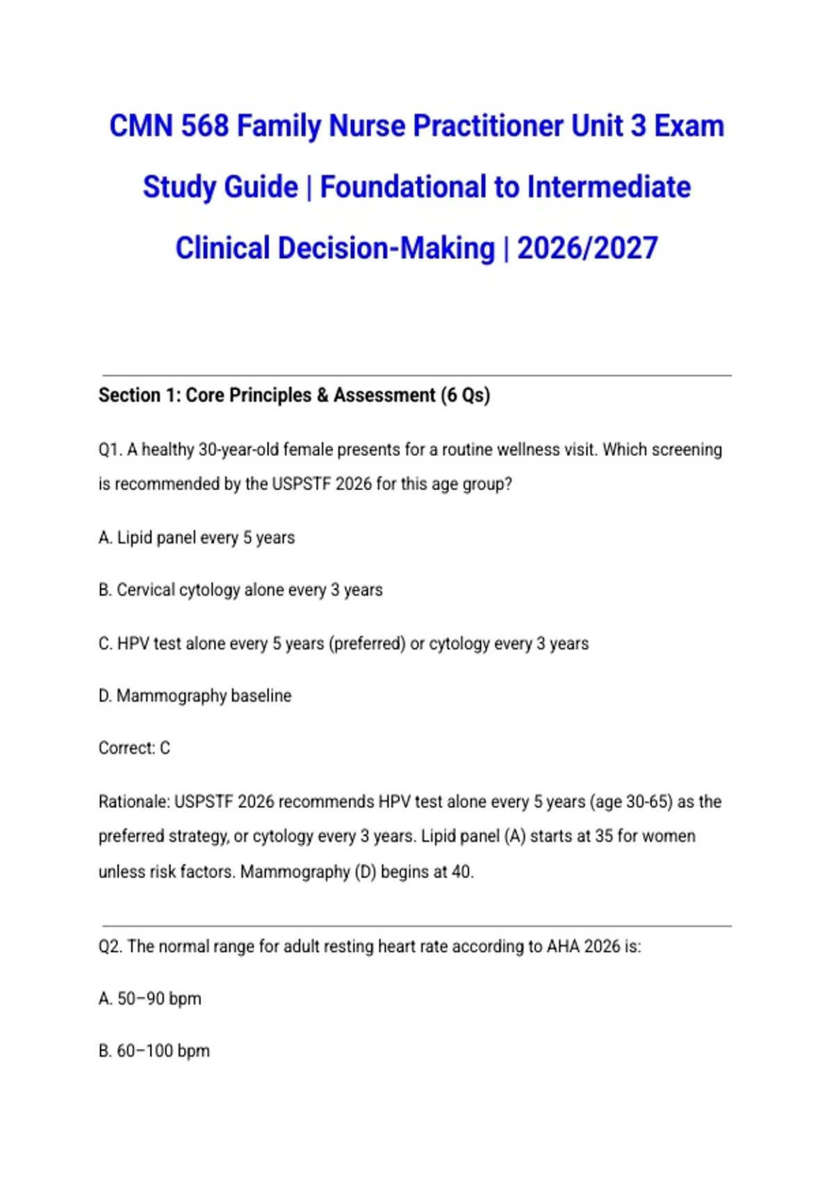 Q1. A healthy 30-year-old female presents for a routine wellness visit. Which screening