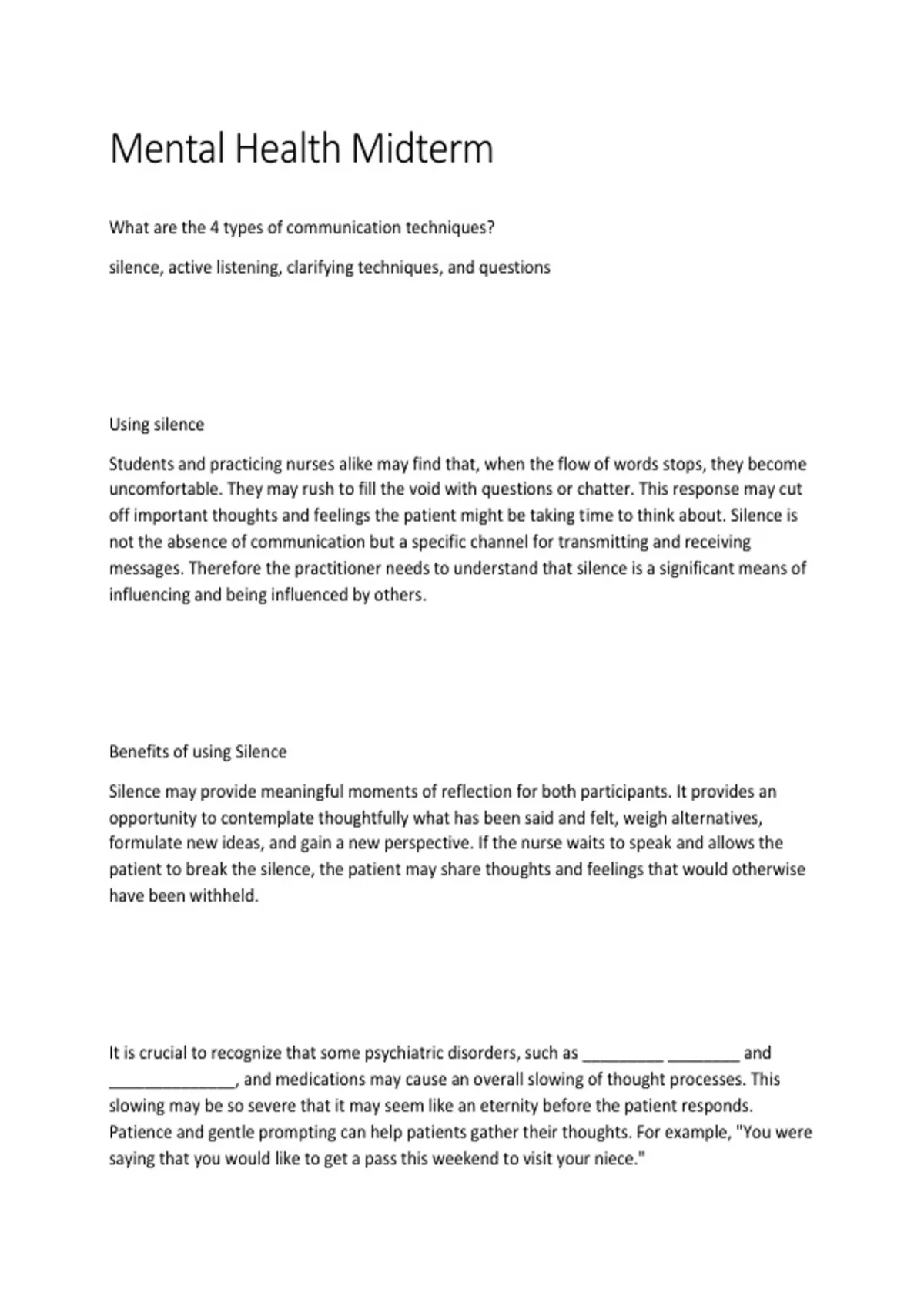 off important thoughts and feelings the patient might be taking time to think about. Silence is