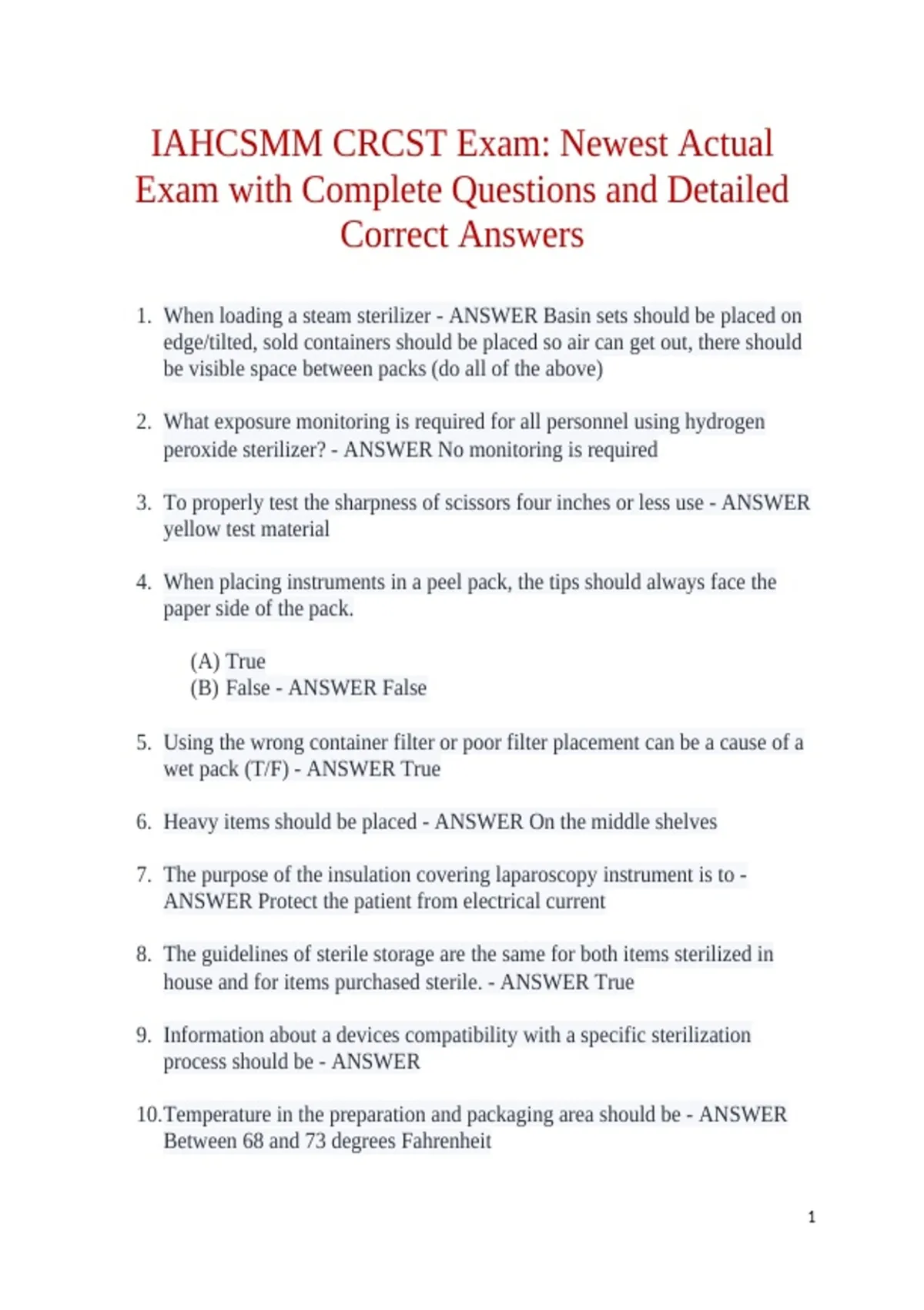 IAHCSMM CRCST Exam: Newest Actual Exam with Complete Questions and Detailed Correct Answers