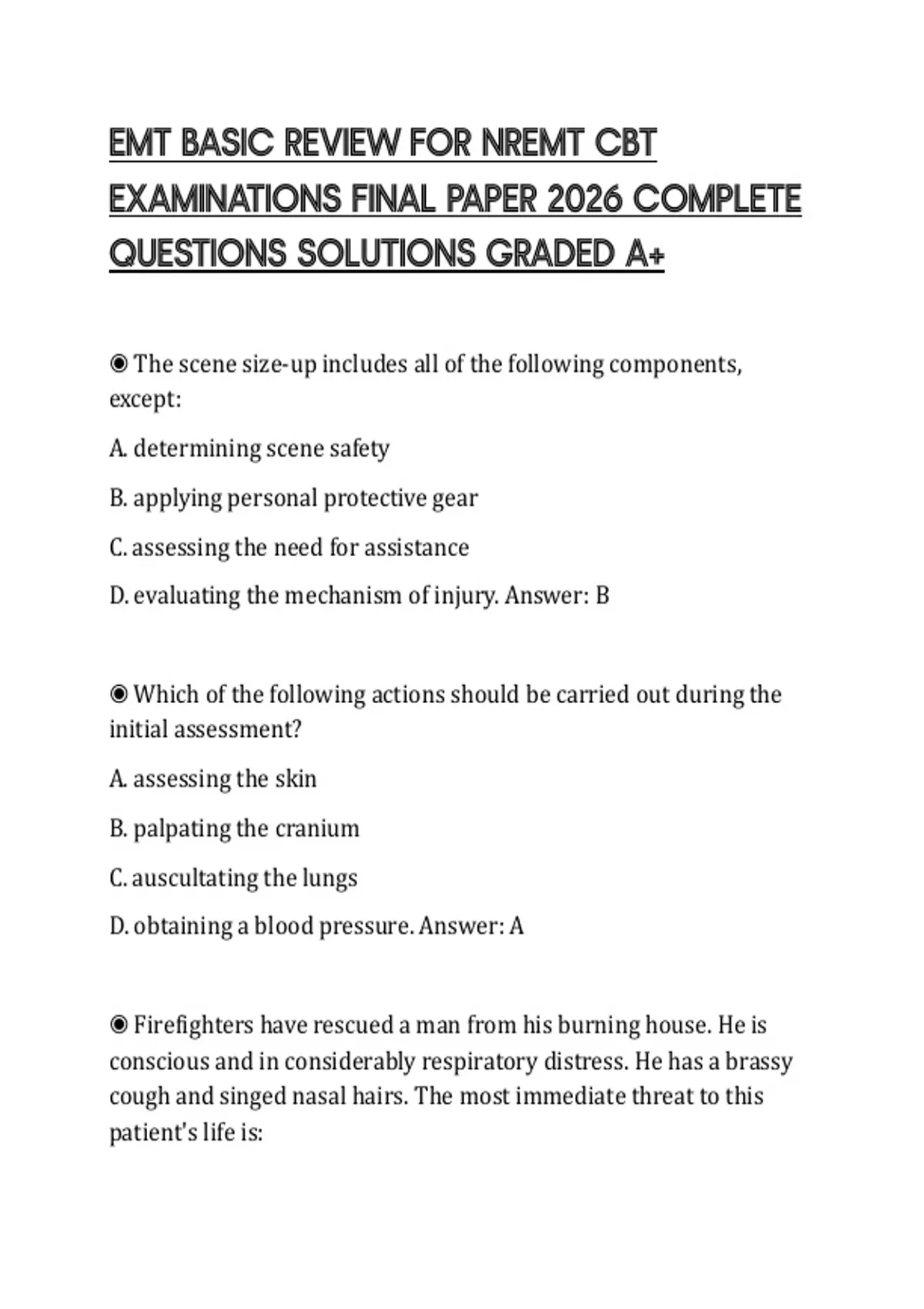 EMT BASIC REVIEW FOR NREMT CBT EXAMINATIONS FINAL PAPER 2026 COMPLETE QUESTIONS SOLUTIONS GRADED A+