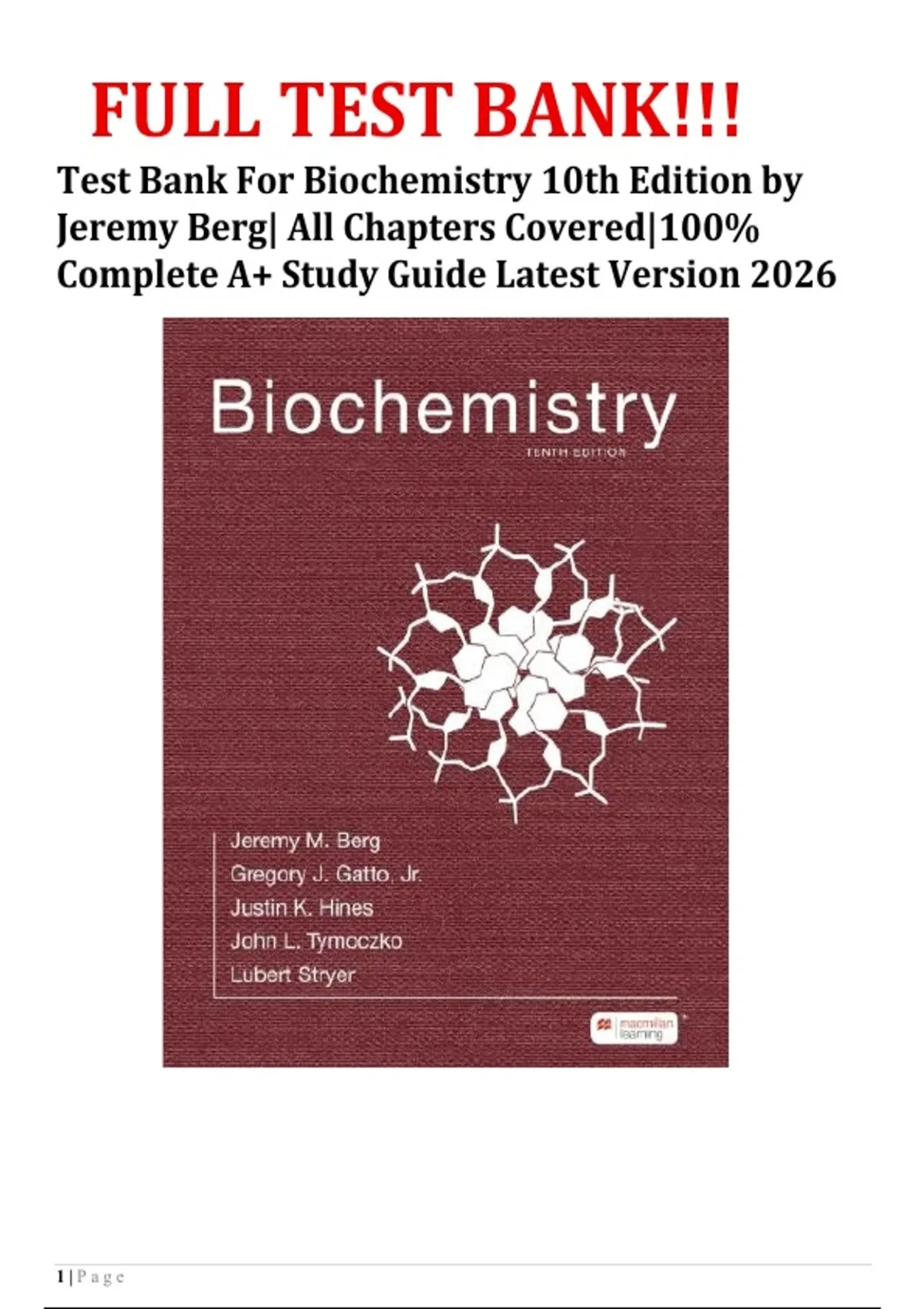 Test Bank For Biochemistry 10th Edition by Jeremy Berg| All Chapters Covered|100% Complete A+ Study Guide Latest Version 2026