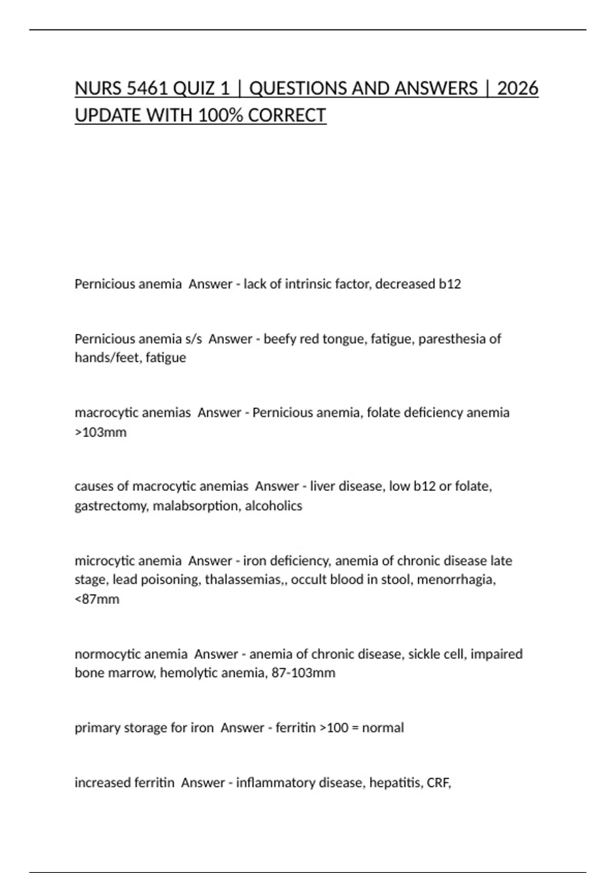 Pernicious anemia s/s Answer - beefy red tongue, fatigue, paresthesia of
