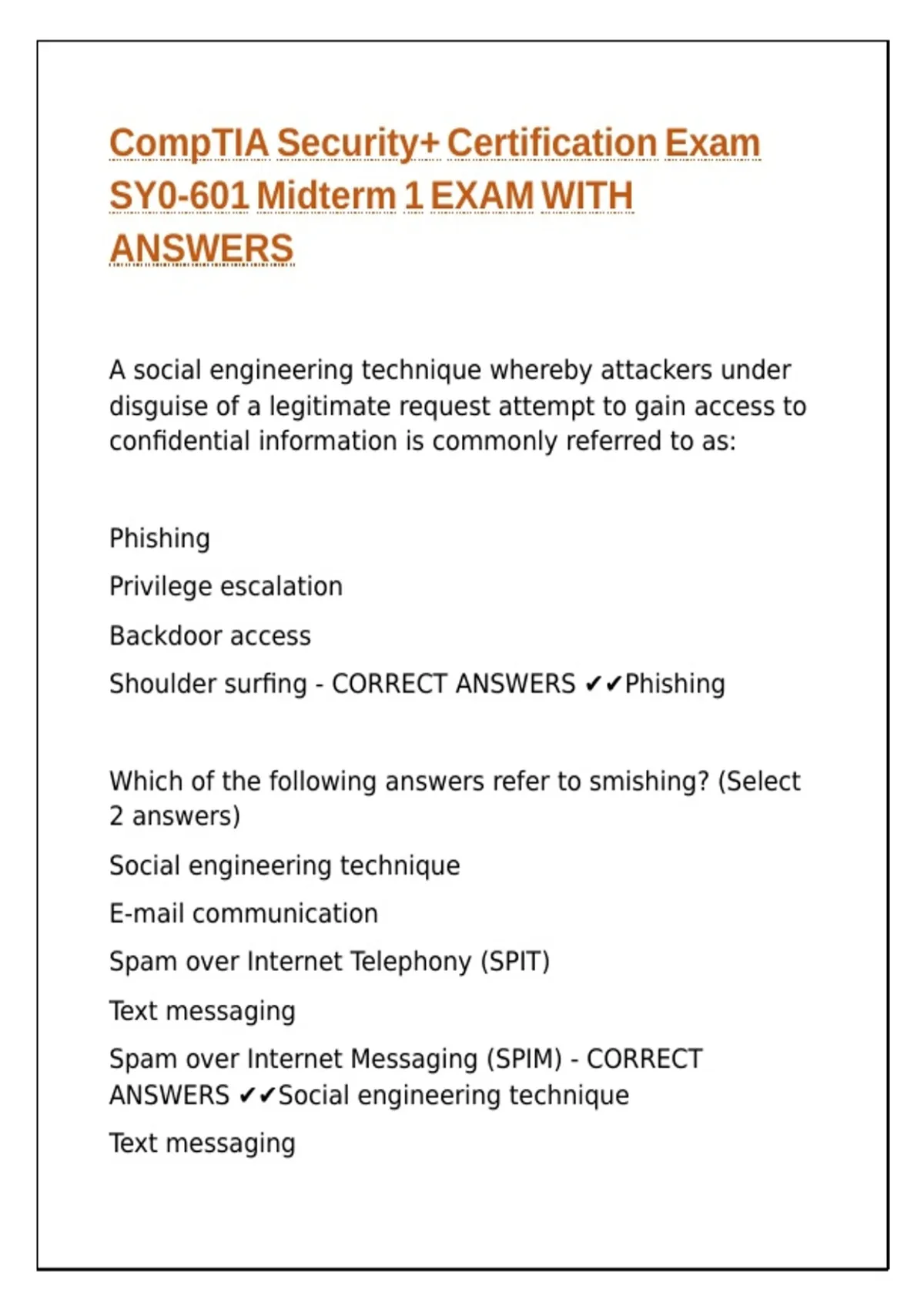 CompTIA Security+ Certification Exam SY0-601 Midterm 1 EXAM WITH ANSWERS