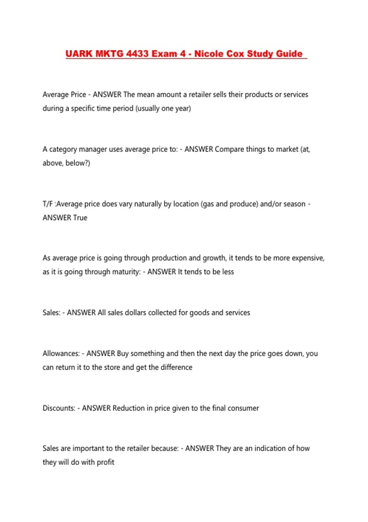 UARK MKTG 4433 Exam 4 - Nicole Cox Study Guide ...
