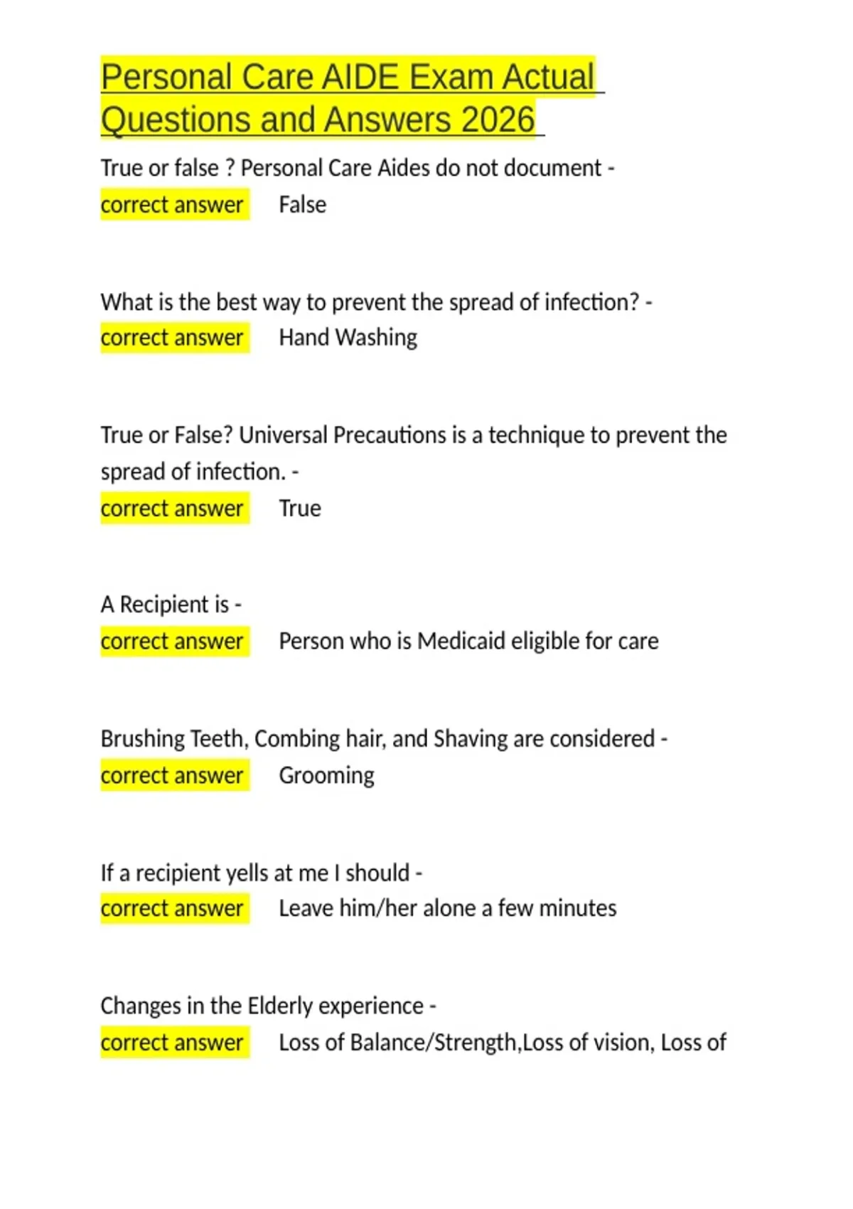 Personal Care AIDE Exam Actual Questions and Answers 2026.docx
