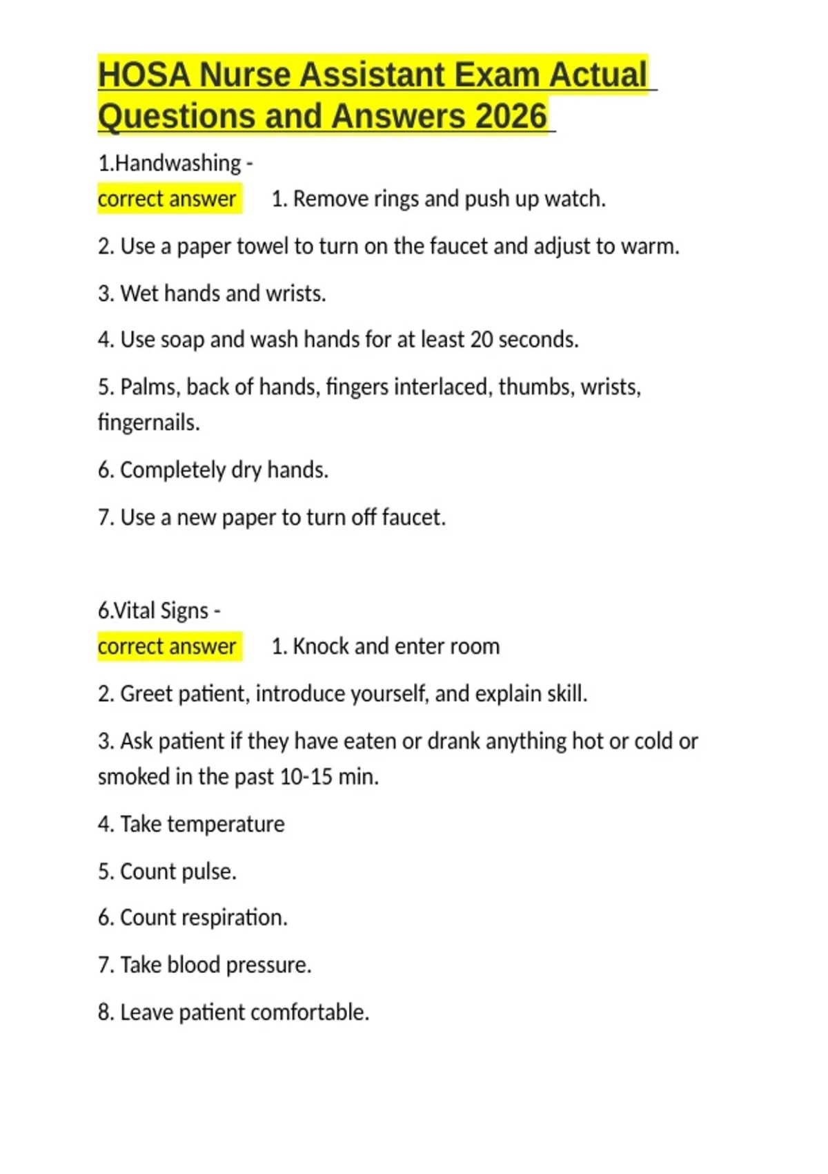 HOSA Nurse Assistant Exam Actual Questions and Answers 2026.docx