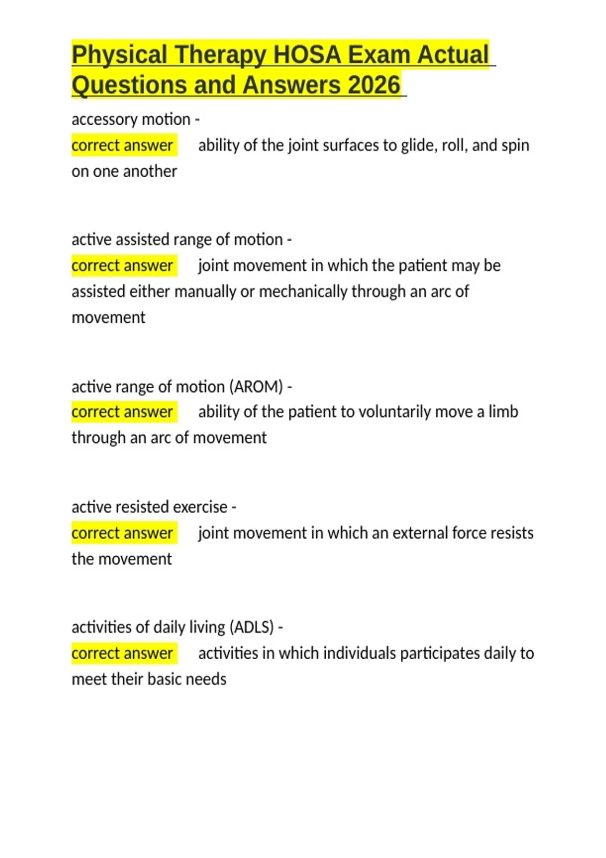 Physical Therapy HOSA Exam Actual Questions and Answers