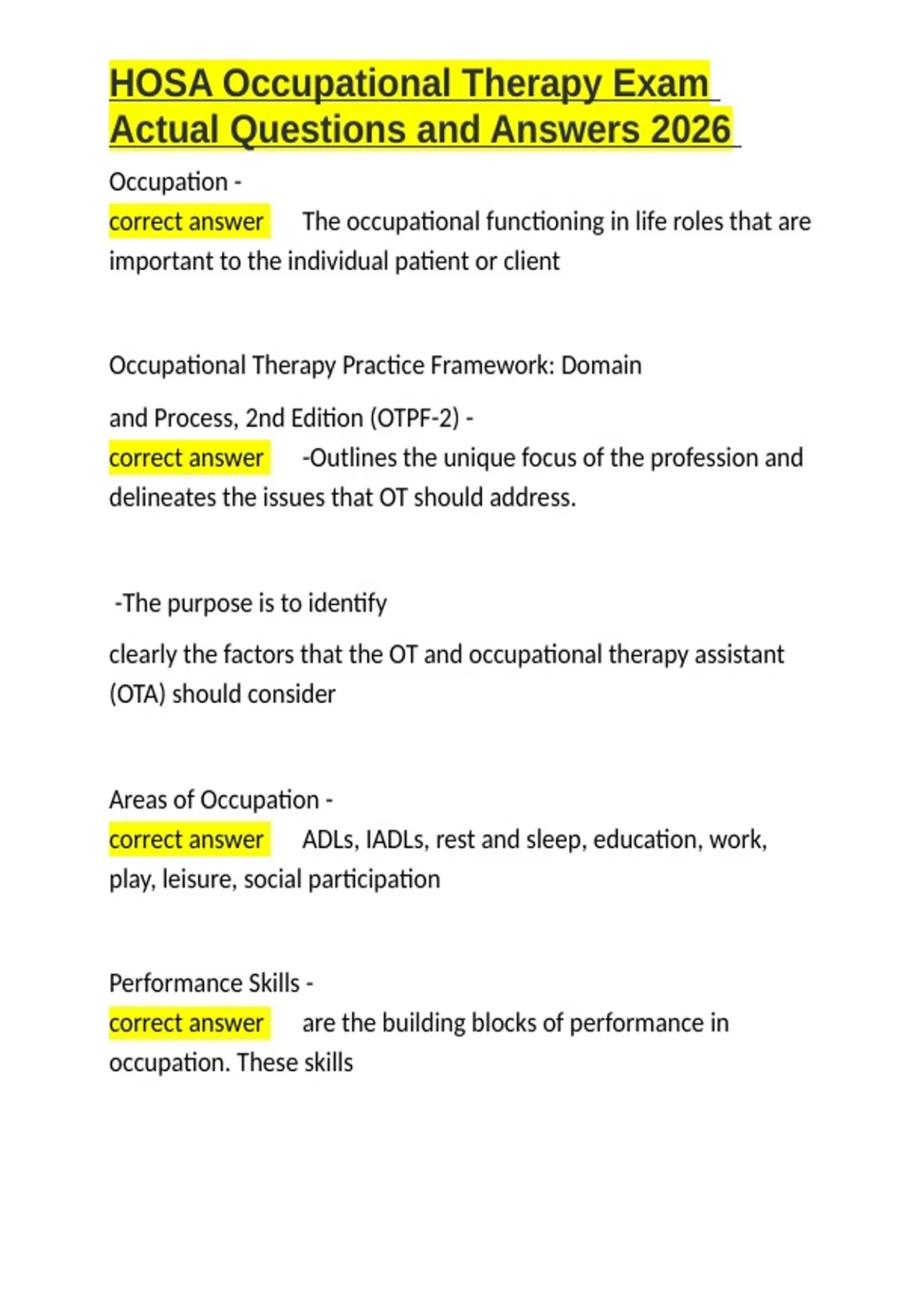 HOSA Occupational Therapy Exam Actual Questions and Answers 2026.docx