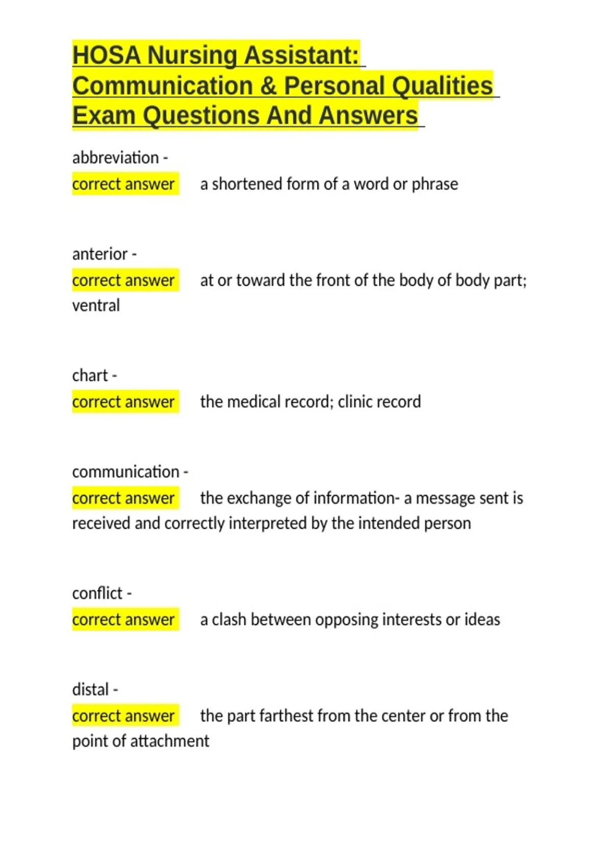HOSA Nursing Assistant Communication & Personal Qualities Exam Questions And Answers.docx