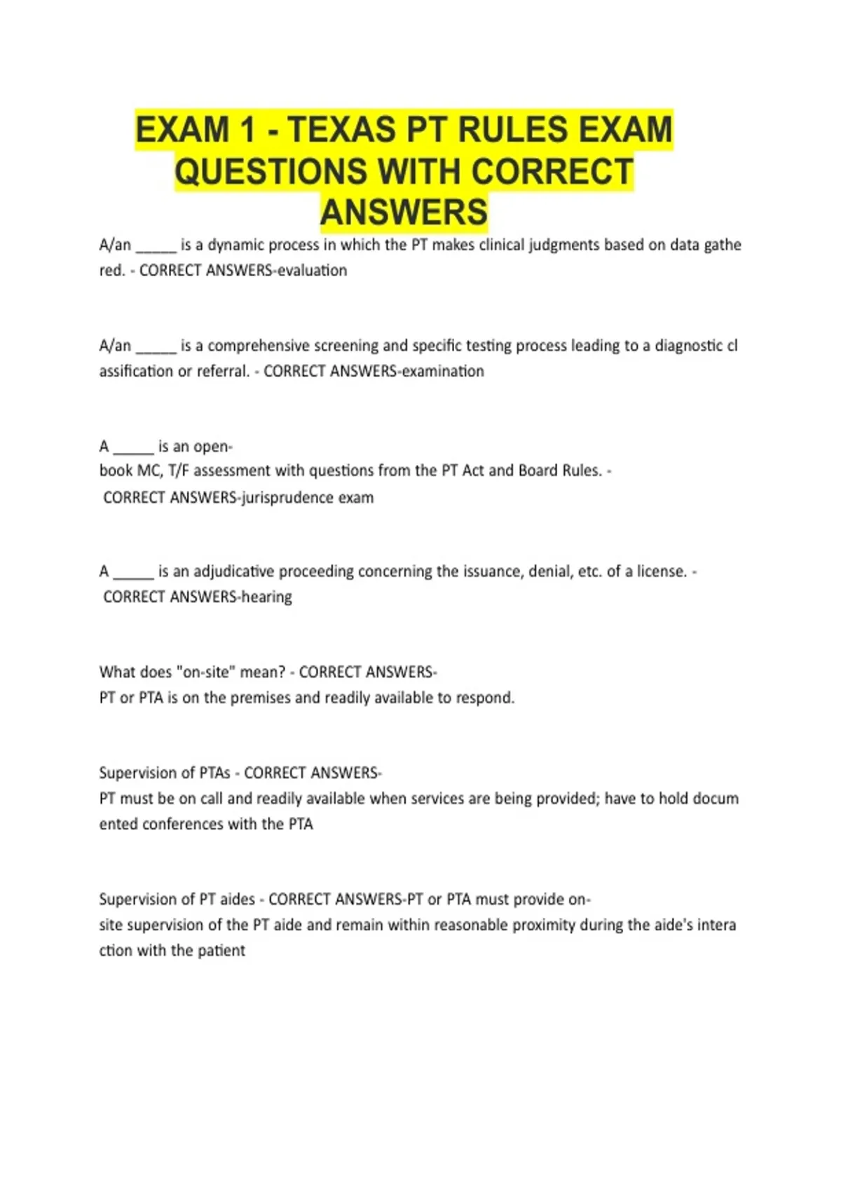 Exam 1 - Texas PT Rules EXAM QUESTIONS WITH CORRECT ANSWERS