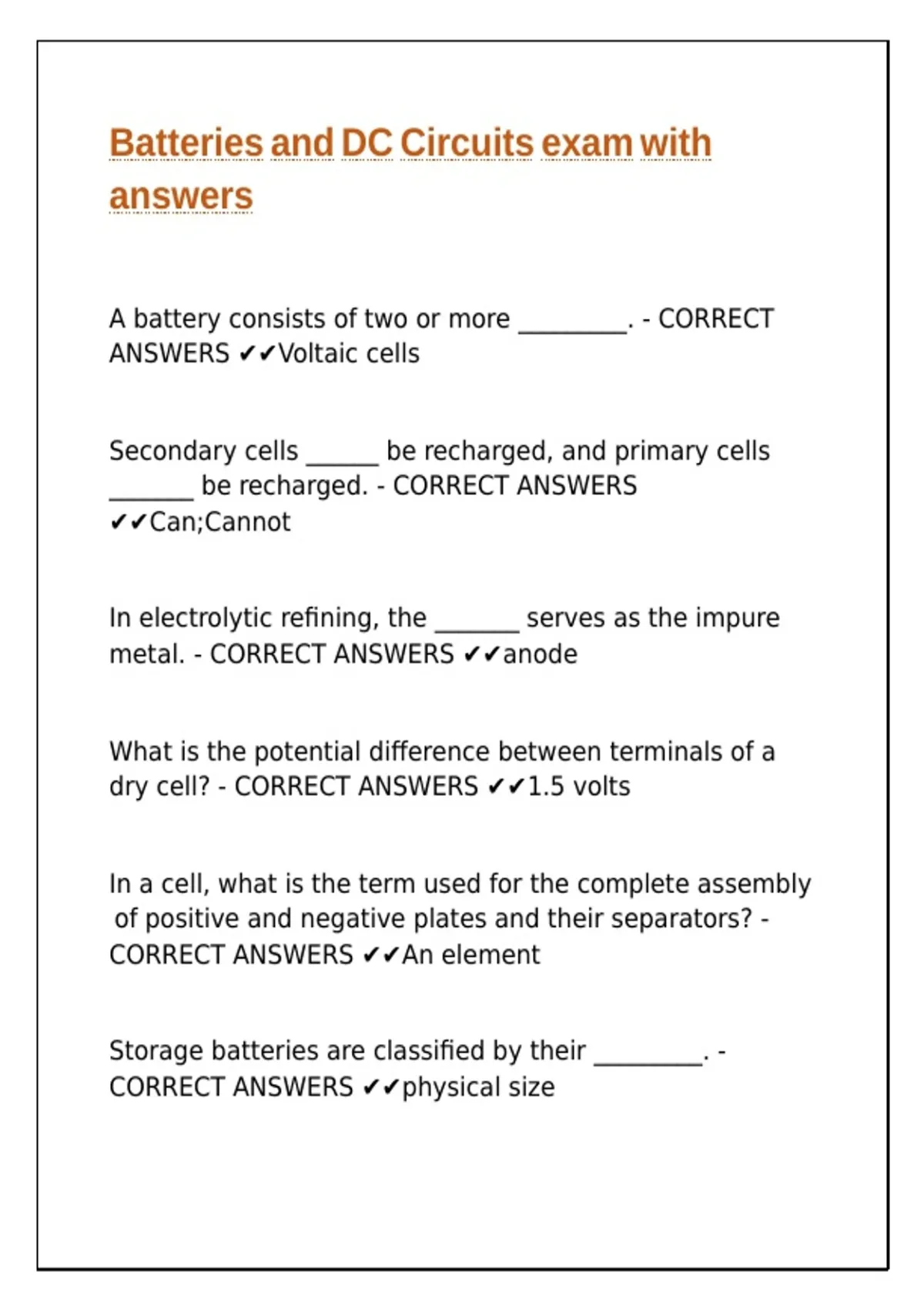 Batteries and DC Circuits exam with answers