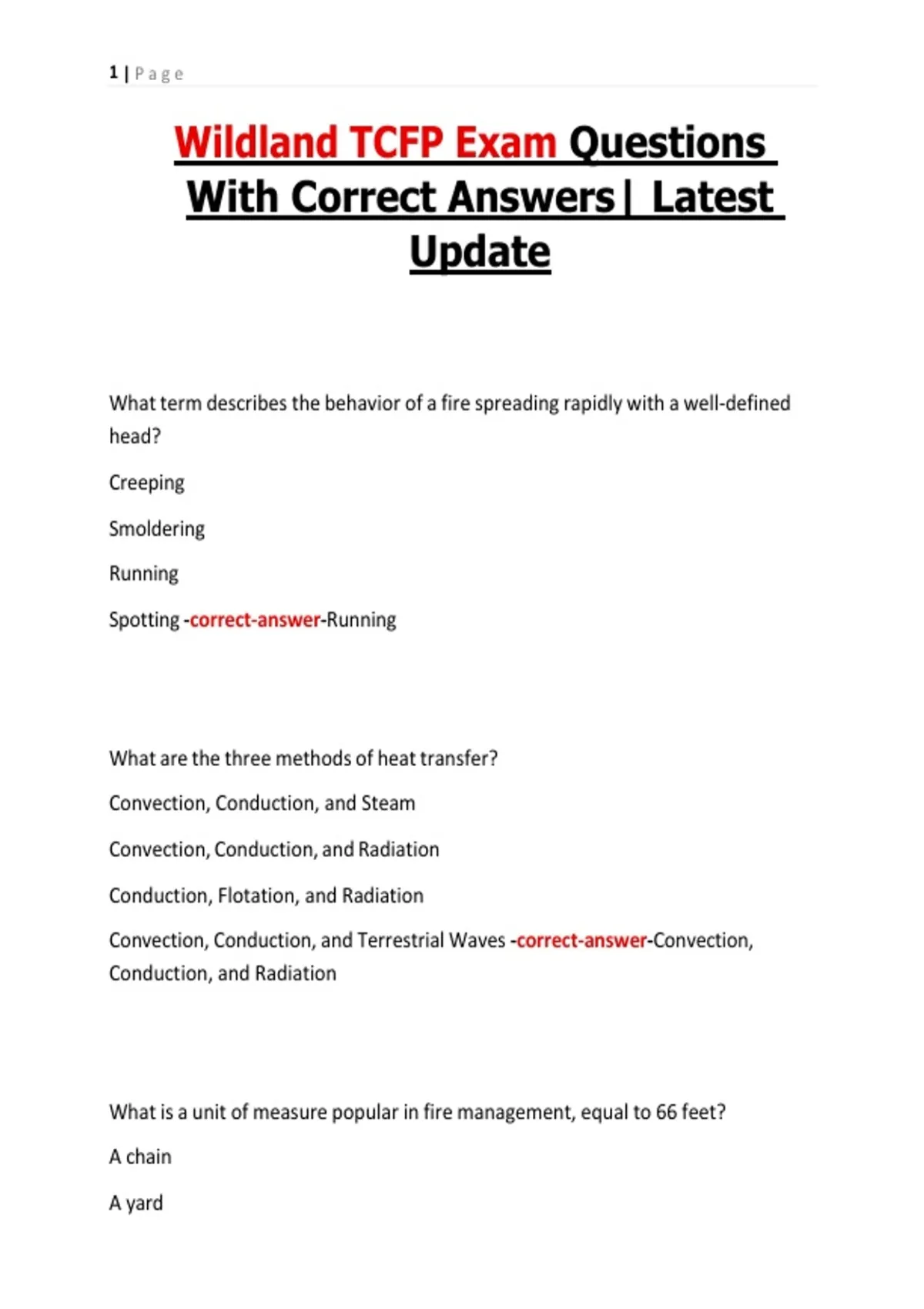 This document contains a comprehensive set of Wildland TCFP exam review questions with correct answers, covering key topics such as fire behavior, weather, fuels, topography, suppression tactics, safety, and firefighting tools. It is designed to help students and firefighters prepare effectively for the Texas Commission on Fire Protection (TCFP) wildland firefighting exam and reinforce core wildland fire concepts.