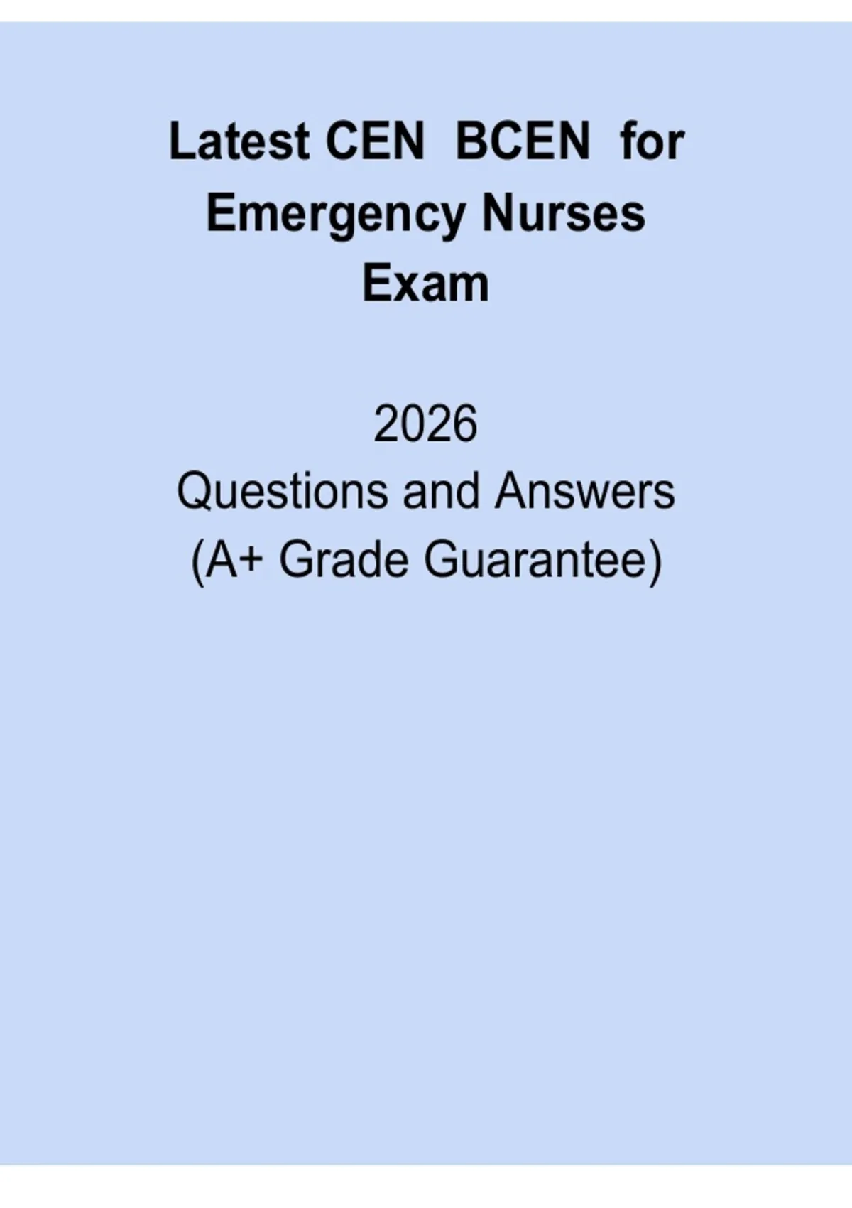 Prepare confidently for the CEN BCEN Exam 2026 with this updated questions and answers PDF designed specifically for emergency nurses. Featuring exam-style questions aligned with current BCEN standards, this resource helps reinforce critical emergency nursing concepts, improve clinical decision-making, and identify knowledge gaps. Ideal for both first-time test takers and recertification candidates, this guide provides targeted practice to boost confidence and improve exam performance.