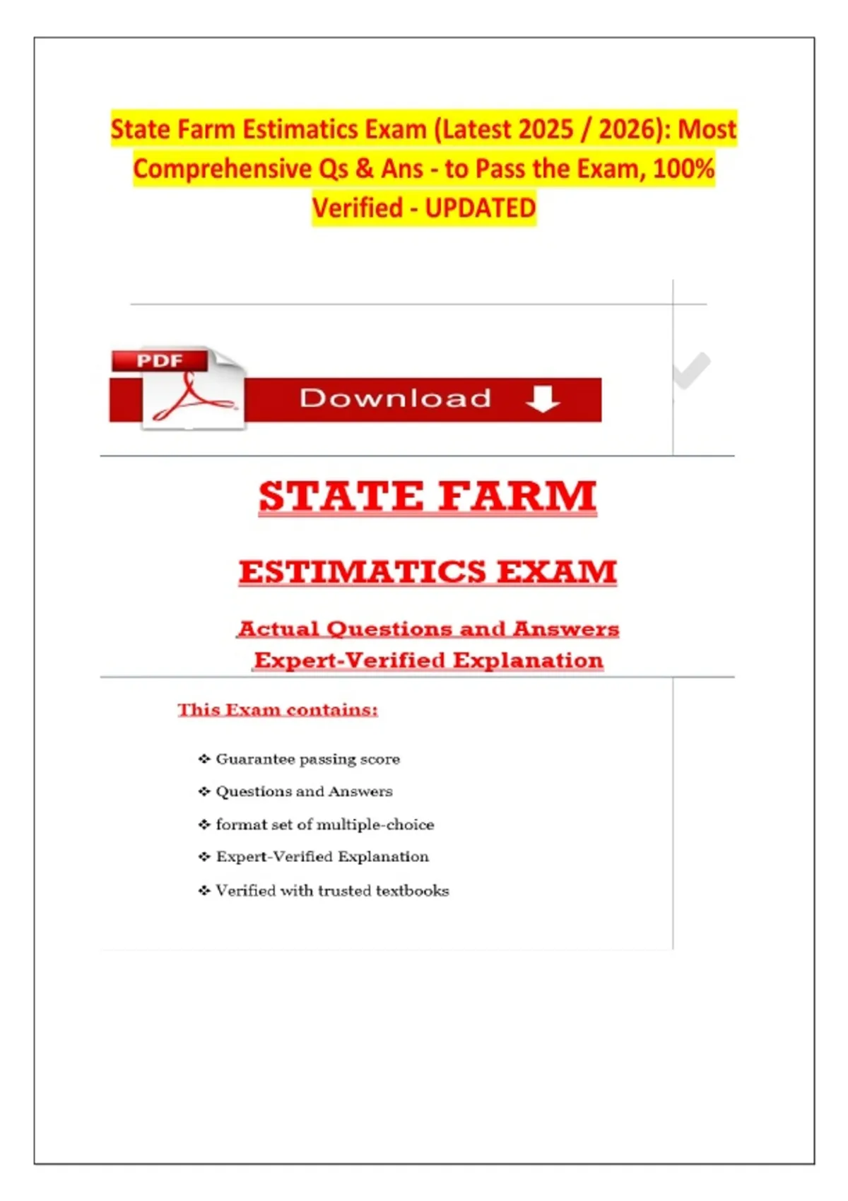******** INSTANT DOWNLOAD PDF FILE ***** State Farm Estimatics Exam (Latest 2025 / 2026): Most Comprehensive Qs & Ans - to Pass the Exam, 100% Verified - UPDATED State Farm Estimatics Exam 2025 comprehensive study guide for beginners, State Farm Estimatics Exam detailed Q&A revision tips 2026, how to pass State Farm Estimatics Exam on the first try 2025, most comprehensive State Farm Estimatics Exam prep material 2026, best strategies for State Farm Estimatics Exam success 2025, step-by-step State Farm Estimatics Exam review and practice 2026, in-depth State Farm Estimatics Exam topics explained for 2025, updated State Farm Estimatics Exam format changes 2026, proven study techniques for State Farm Estimatics Exam 2025, State Farm Estimatics Exam question bank and solutions 2026, expert tips for acing State Farm Estimatics Exam 2025, advanced State Farm Estimatics Exam resource guide 2026, common pitfalls and how to avoid them on State Farm Estimatics Exam 2025, top online courses for State Farm Estimatics Exam preparation 2026, free sample questions and answers for State Farm Estimatics Exam 2025.