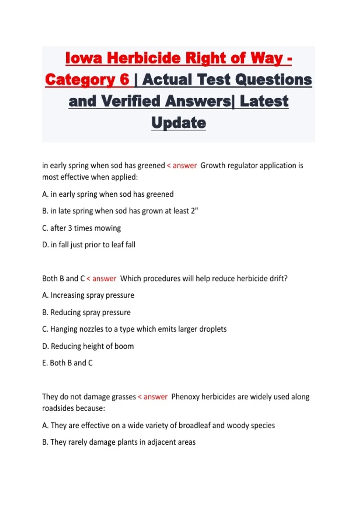 This document contains the complete Iowa Herbicide Right-of-Way Category 6 exam with fully correct, graded answers, covering herbicide application, drift management, equipment calibration, weed identification, safety, and regulations. It is intended for applicators preparing for the Iowa Category 6 certification and closely reflects the concepts, terminology, and scenarios used on the official exam.
