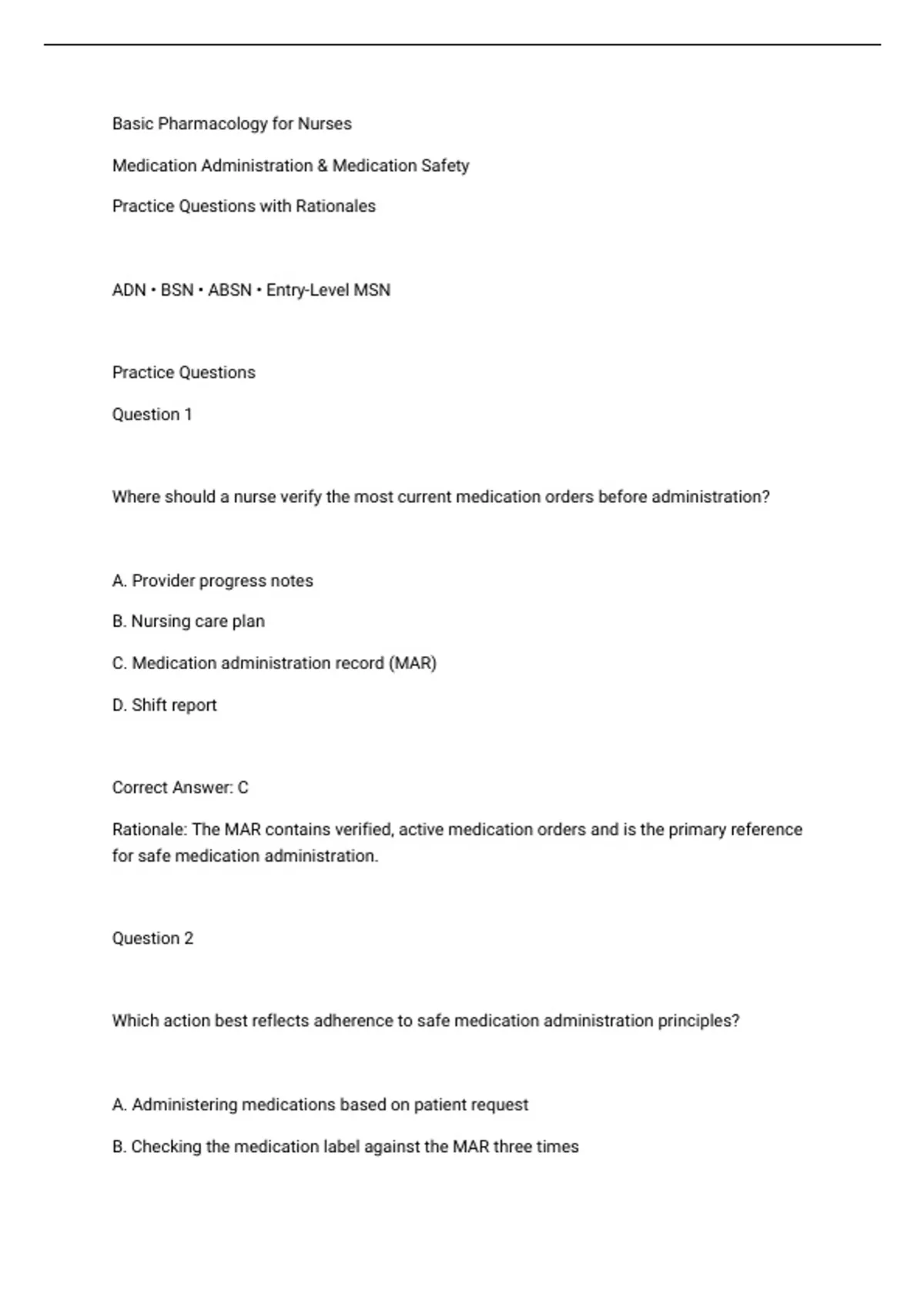 Practice Questions Question 1 Where should a nurse verify the most current medication orders before administration? A. Provider progress notes B. Nursing care plan C. Medication administration record (MAR) D. Shift report Correct Answer: C Rationale: The MAR contains verified, active medication orders and is the primary reference for safe medication administration. Question 2 Which action best reflects adherence to safe medication administration principles? A. Administering medications based on patient request B. Checking the medication label against the MAR three times